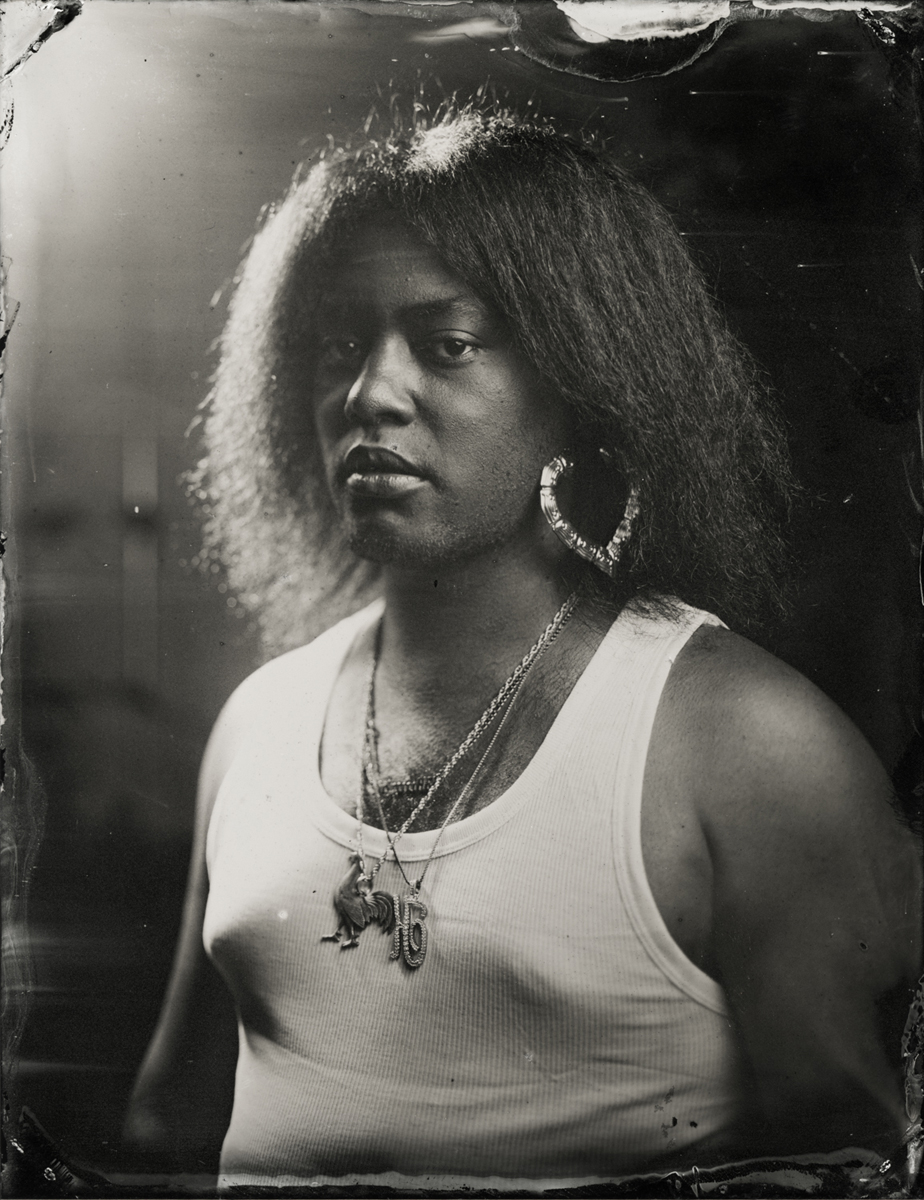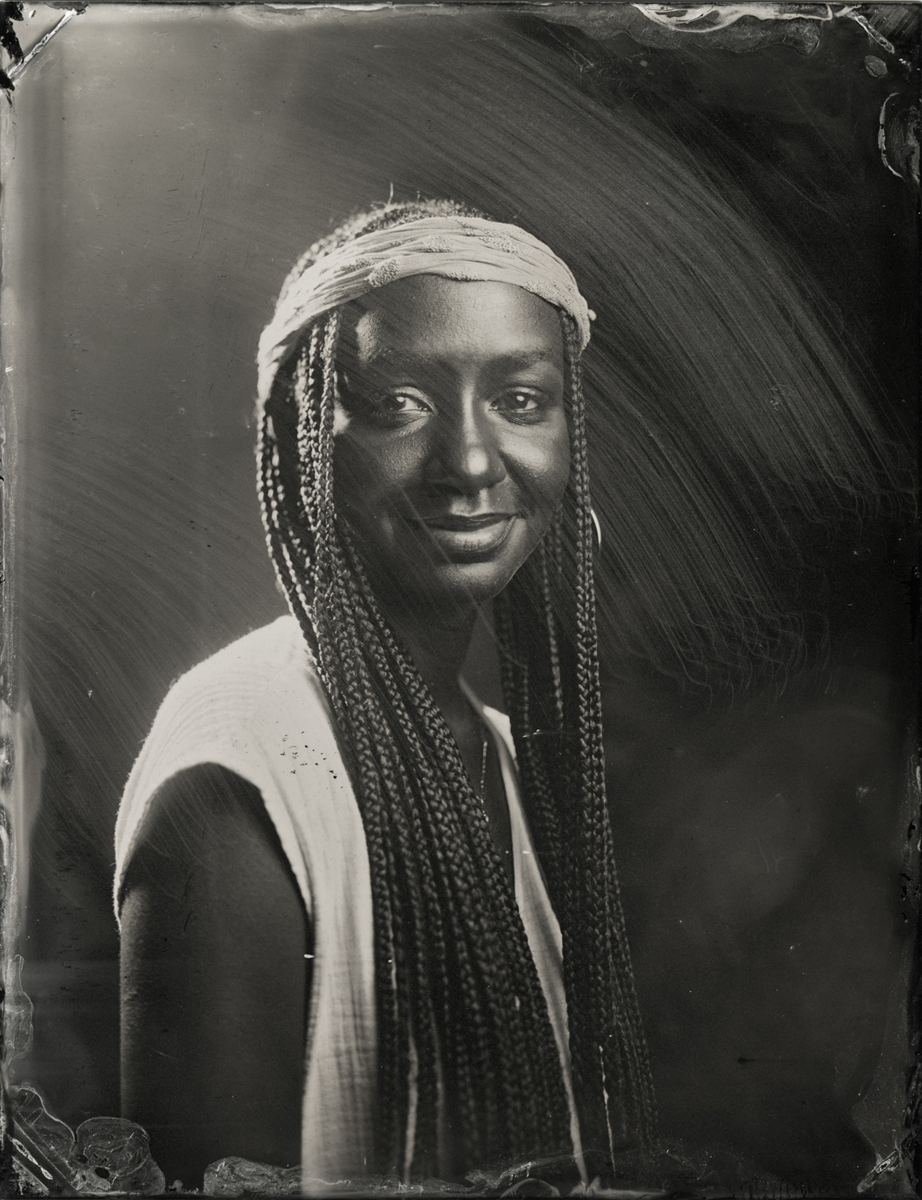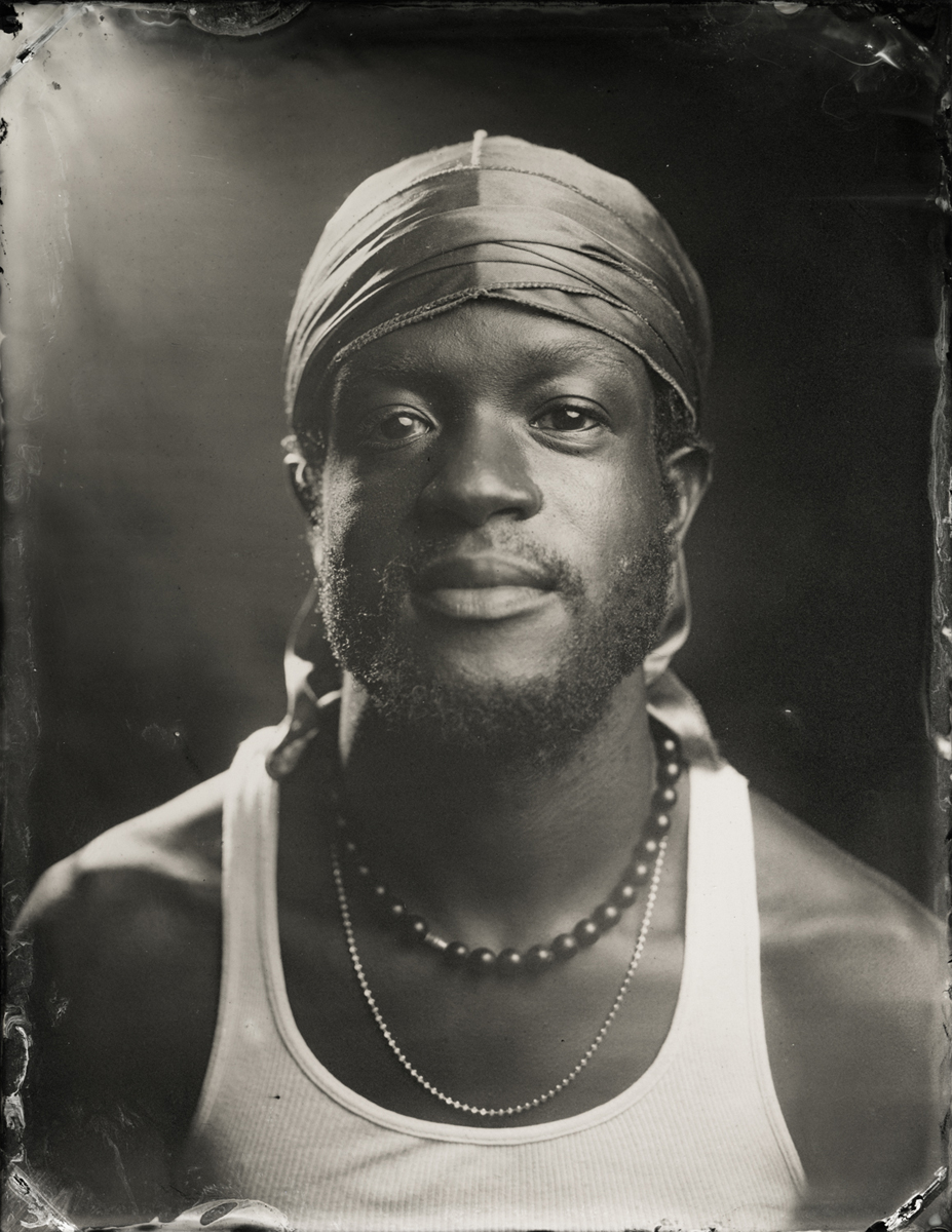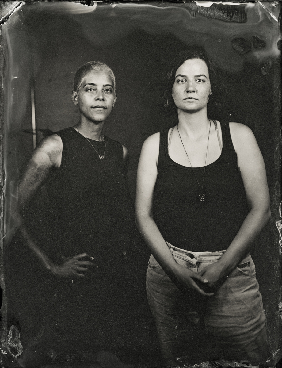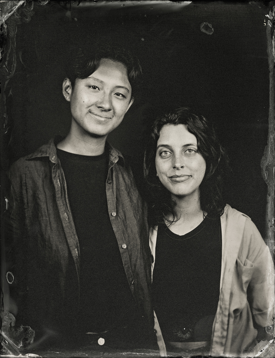 Elena Volkova: A tintype (or, wet plate collodion) is a photograph made by creating a direct positive on a thin sheet of metal coated with collodion and light-sensitive silver nitrate. During the sessions, each plate is hand-coated, exposed in camera, and developed instantly, with the process visible to the participants.