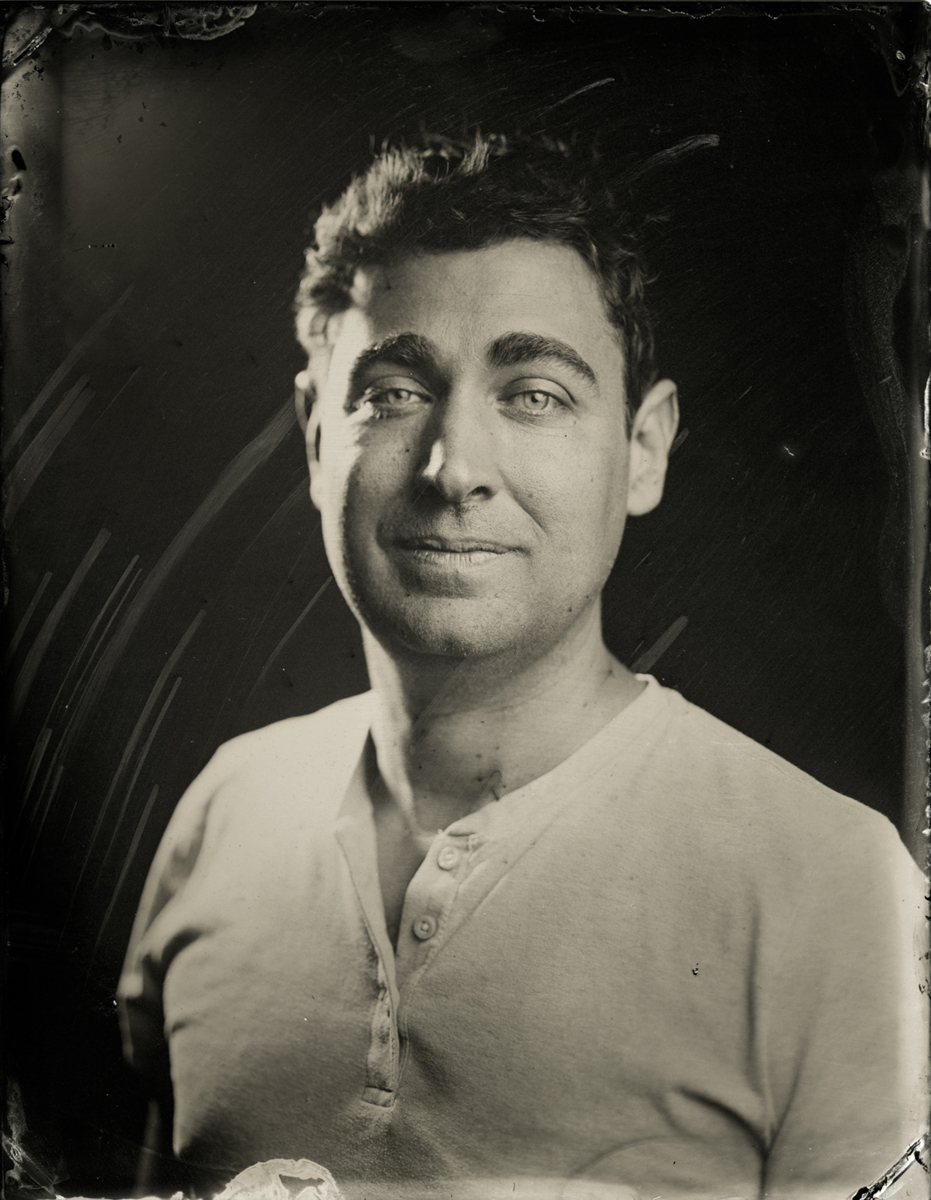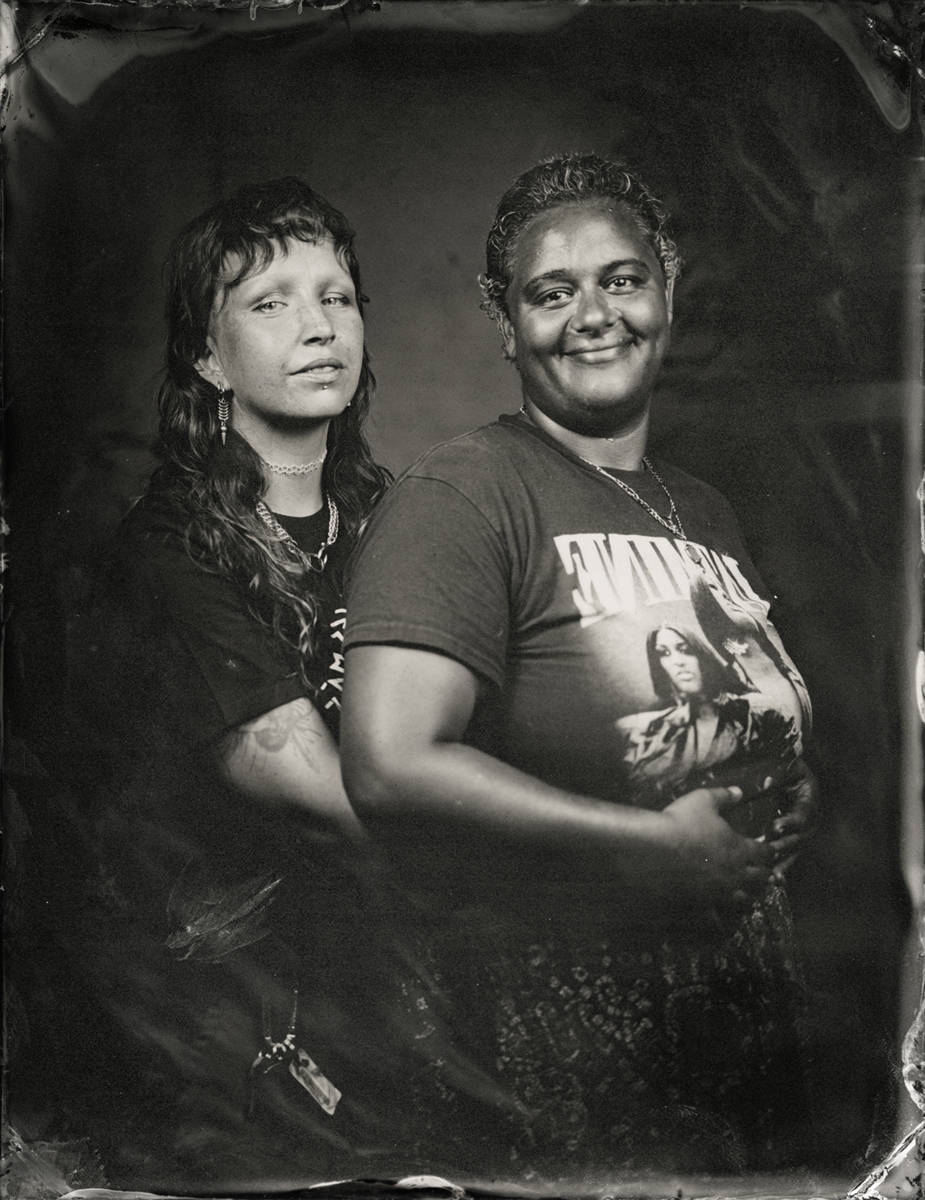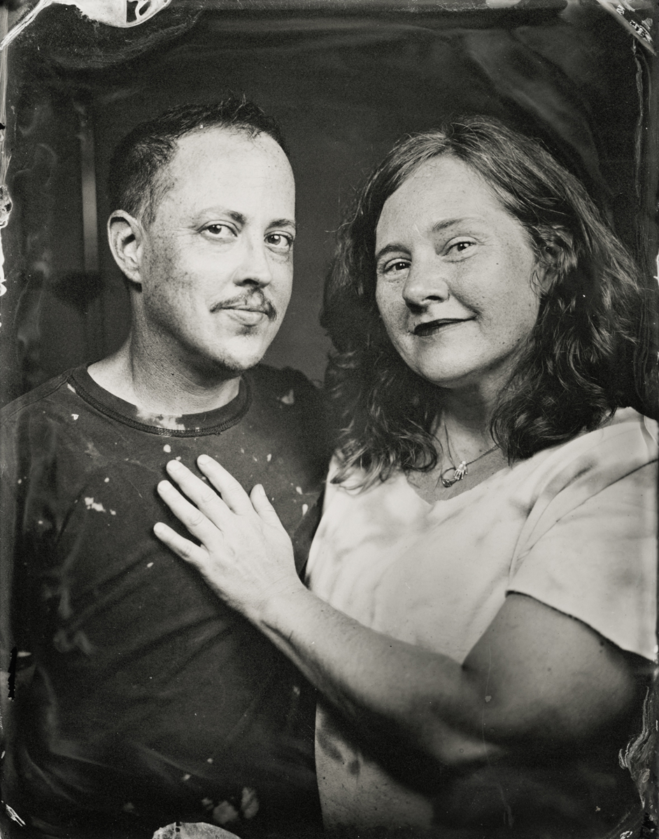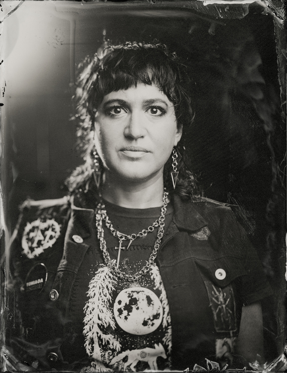 Elena Volkova: A tintype (or, wet plate collodion) is a photograph made by creating a direct positive on a thin sheet of metal coated with collodion and light-sensitive silver nitrate. During the sessions, each plate is hand-coated, exposed in camera, and developed instantly, with the process visible to the participants.