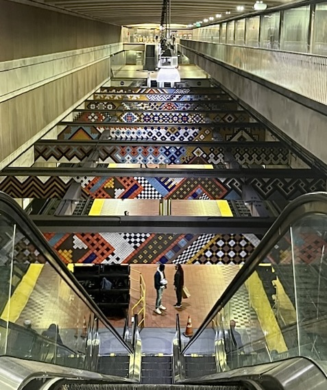 Two to all other readers: We public transportation users are often in a hurry. Rushing to make it through the closing doors of the about-to-take-off Metro train at the Lexington Market stop, or feeling the necessity to catch up on texts and emails on our phones, it could be easy to miss a full-fledged experience of Alexander’s “Geometro.” But public transportation users are more often than not repeat users. So if you’re a frequent Metro traveler and use the Lexington Market entrance or exit, or you’re a regular shopper at the Market itself, or you’re just game for a visual adventure: For just the cost of a Metro pass ($1 seniors/people with disabilities, $1.50 students, or $2 full fare) to get through the gate, I strongly suggest riding that escalator with focused attention and intention. In other words: