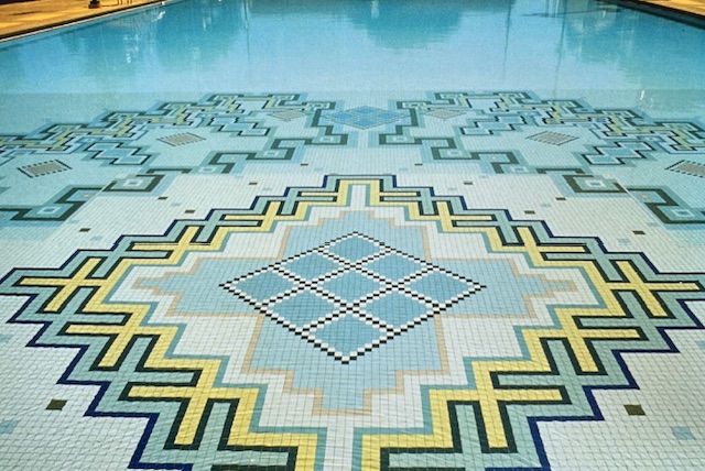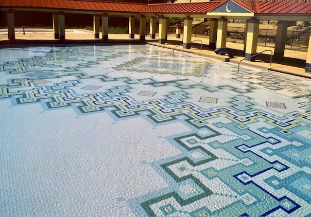 Some of you readers may have been lucky enough to have been able to look down at Alexander’s patterned stretch of tiles that formed “Oasis” and to witness its ever-changing shimmer of shapes, the shimmer caused by your own movements and those of other swimmers, or merely by the wind. And in this case, pushing off from the top step would have been safe, unlike my overly imaginative flight across the Lexington Market Metro stop’s “Geometro” beams. At the pool, to push off and float above the tiled “oasis” would offer a delightfully cloudy view of the tilework (if chancing chlorine-itchy eyes) or a crystal-clear view (if wearing goggles).