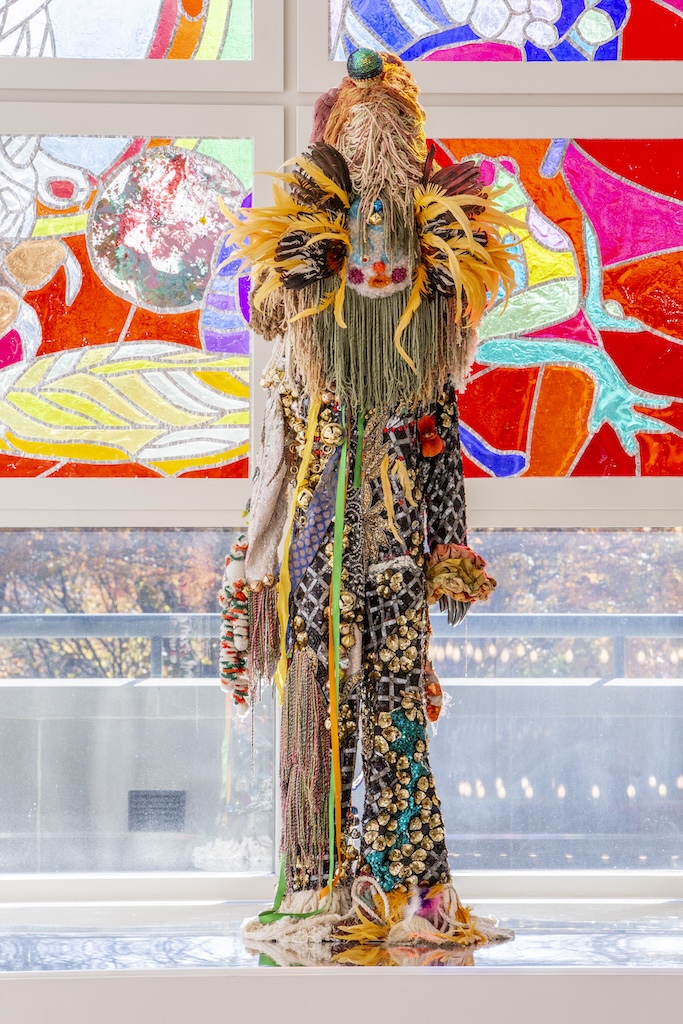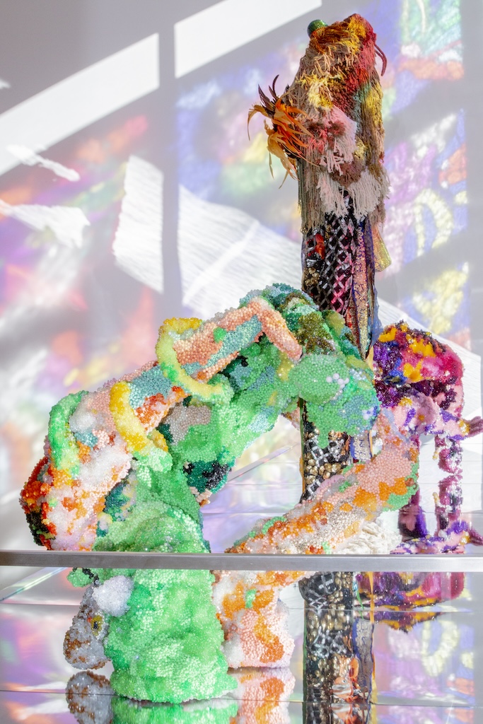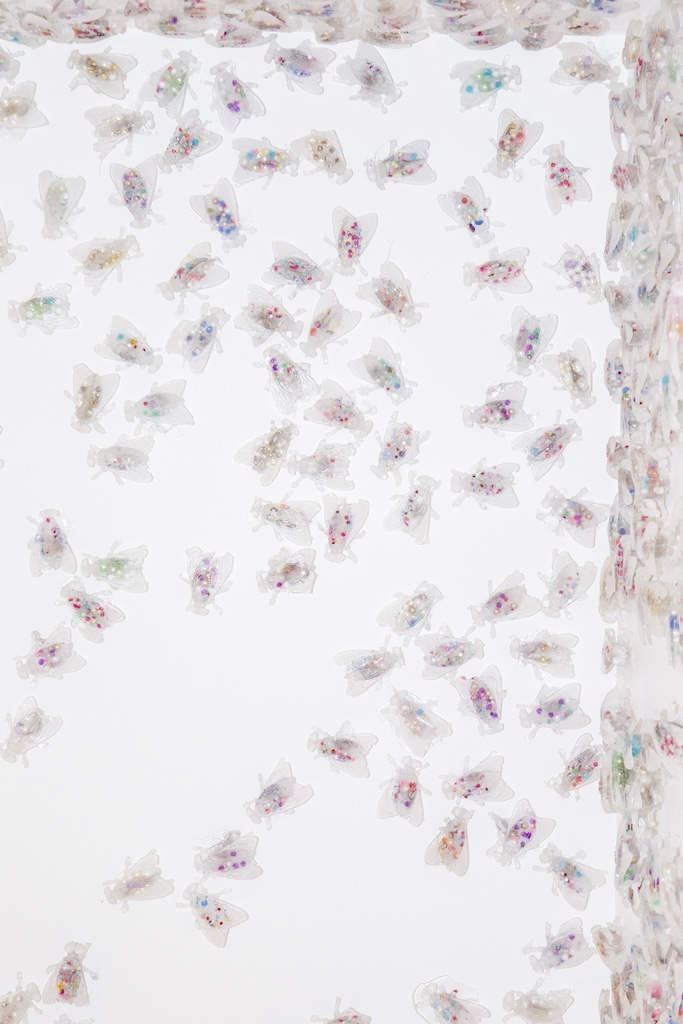 Five ornately beaded (and sometimes otherwise adorned) mutant statues sit, lurk, dance, or stand across the two levels. Nine-hundred-and-ninety-nine tiny clear resin insects—each containing a strand of the artist’s own hair and assortment of his trademark colorful beads—swarm across the walls of the double-height space. Presiding over it all is a glittery humanoid figure suspended in a chandelier cocoon, meeting visitors’ curious gazes with a mask-like grin.