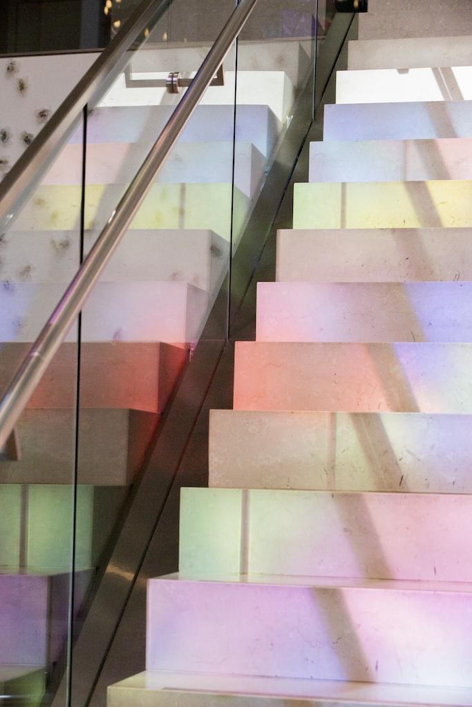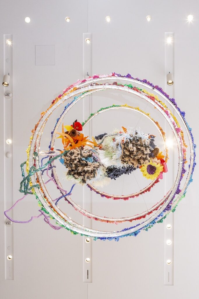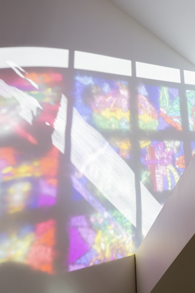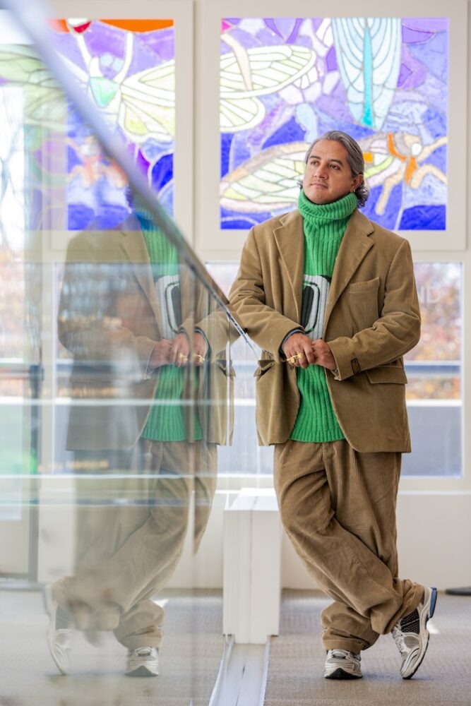 We’re standing on the second floor of the BMA’s East Lobby, in the midst of the prolific artist’s epic installation and imagine you are here. Considering the scope and detail of the various maximalist objects and interventions on display, it’s easy to see why de Nieves might need an extra hand. Twenty-seven panels of meticulously cut, layered, aluminum-taped, and resin-enforced colorful acetate panels create the illusion of biophilic stained glass windows above.