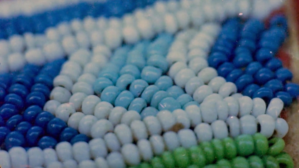 At the same time, though, the film also evokes thoughts of the past, and of who controls its telling. McIntyre’s use of merely partial pans and blurred focus render the red, white, and blue beads strikingly elusive: the subject is not fixed or clear. McIntyre thus practices a politics of refusal, as she avoids the steady, clinical, and nominally objective visual style long embraced by European science. The past, here, remains fugitive, silent, and only partially visible. And so while the title of the film is a partial ode to a relative, it’s clear that seeing her is not so simple after all. Indeed, McIntyre implies that relating to her great-grandmother may only really be possible through loving, hands-on creative work.