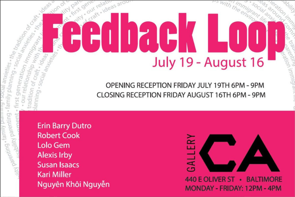 Feedback Loop is an exhibition of works made by current MFA candidates in the Studio Art program at Towson University. This past spring, they came together for a critique seminar course where they became intimately familiar with one another’s work. There, they offered criticism, support, and comradery to accompany their studio practices. The artists are at varying stages in their educational and career paths, a quality that strengthens their ability to offer diverse perspectives. The work in this exhibition confronts complications of disability parenting, anxiety and fear, the tradition of craft, as well as ideas around community and our relationship with the environment. In asking for the opinions of others, artists make themselves vulnerable as a means to better understand the world. This idea was cultivated throughout the semester, as the group opened themselves up to better understand their own motivations. While these artists’ disciplines range from painting and sewing to graphic novels and installation art, there is an underlying curiosity around the human condition and the desire to connect.