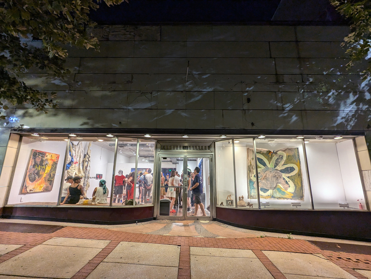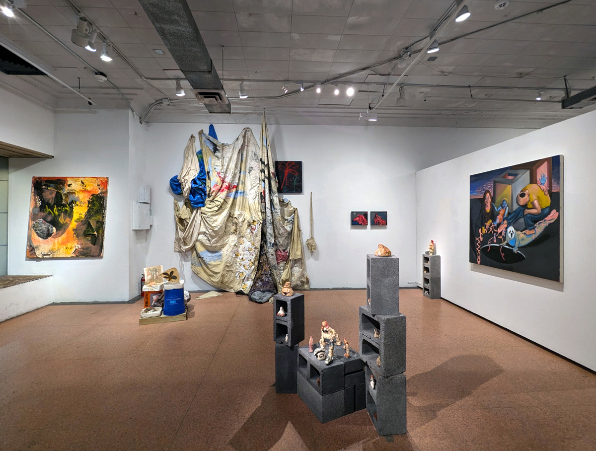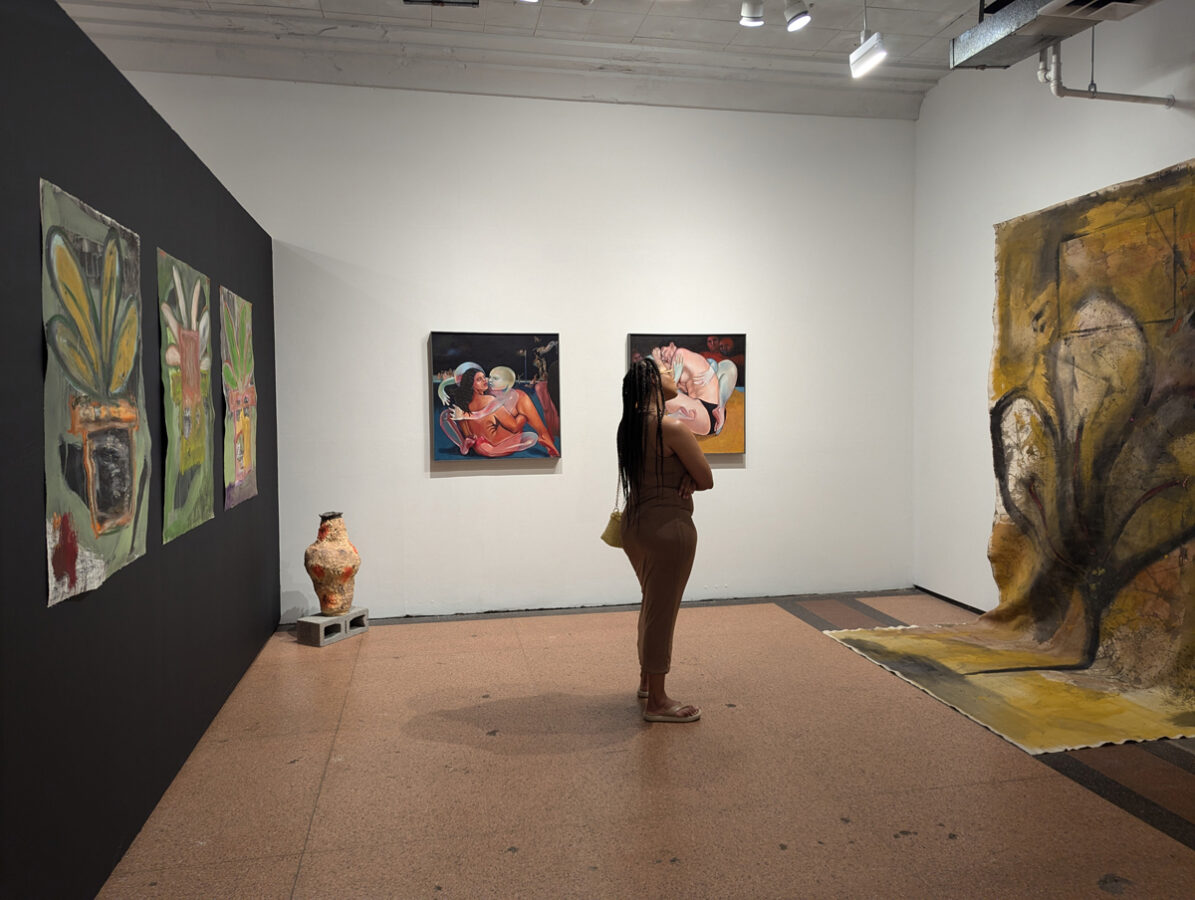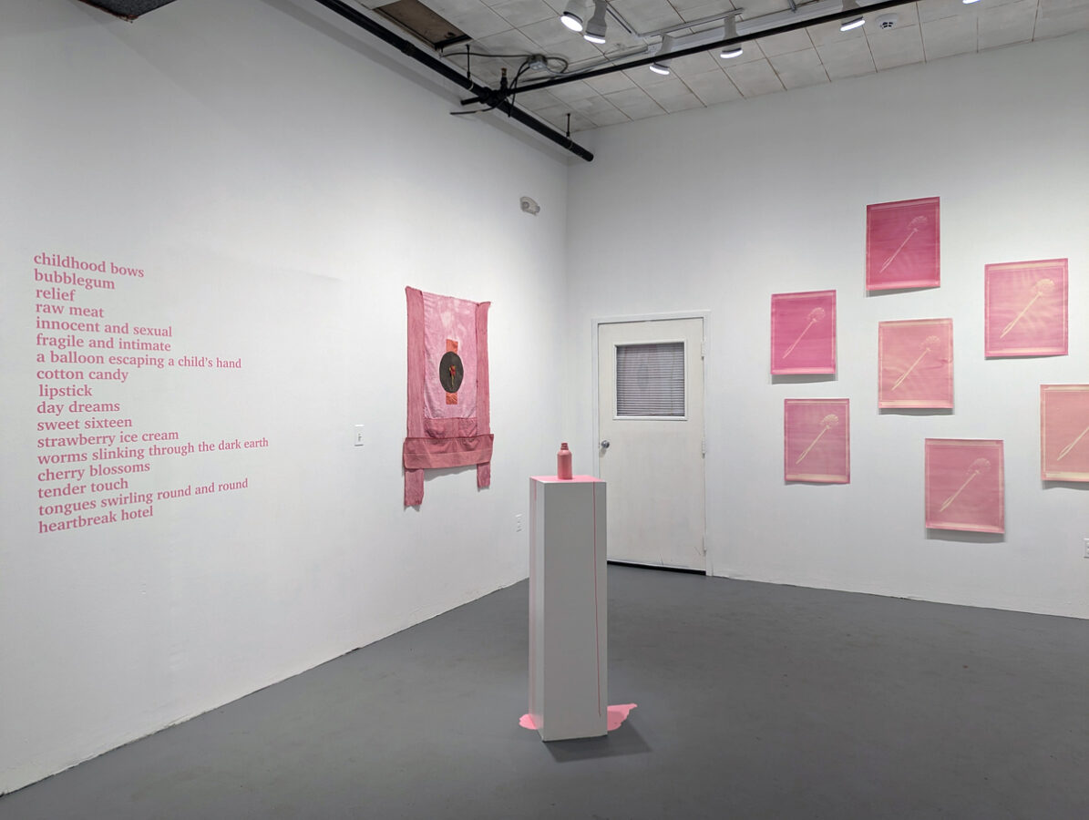 Current Space’s newest exhibitions—Monique Crabb’s solo show Love and Cruelty and Viscous featuring True Arizola-Lyons, Charles Mason III, and Monica Mirabile—are a sight to behold, together. Each artist pulls you into a distinctly different environment, with its own rules, message, and visuals. While Viscous’ artists invite you to experience different spheres of artwork that will have you wanting to go round and round the gallery to inspect all of its details, Love and Cruelty propels us into a bubblegum pink world that will urge you to call your mom and to invite her to dinner when you eventually exit.
