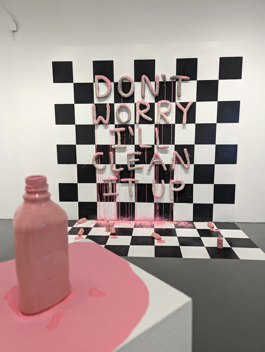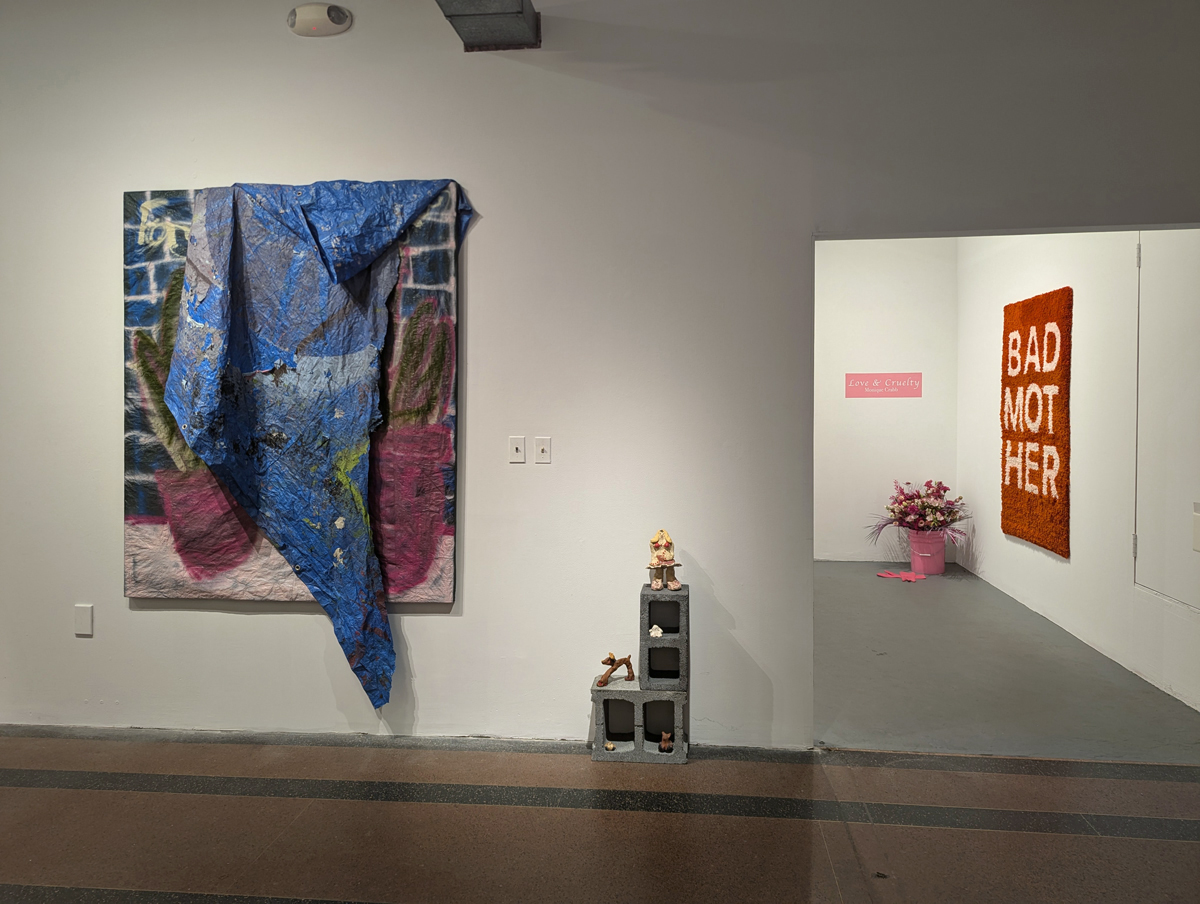 Monique Crabb’s solo exhibition, Love and Cruelty, uncovers the multidimensionality inherent to motherhood, a role equally full of sacrifices, nurture, and unconditional love. The exhibition evokes a preppy 50’s aesthetic, with its central black and white mural and bubblegum pink artwork. Satirically feminine in its depiction of gendered labor, the exhibit comfortably flips imagery that has been weaponized by the patriarchy into campy and fun renditions I can easily picture in Barbie’s Dreamhouse.