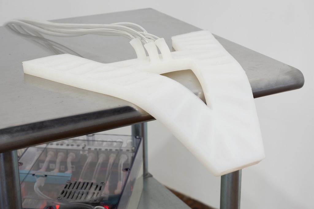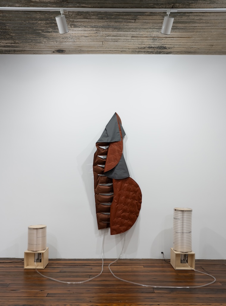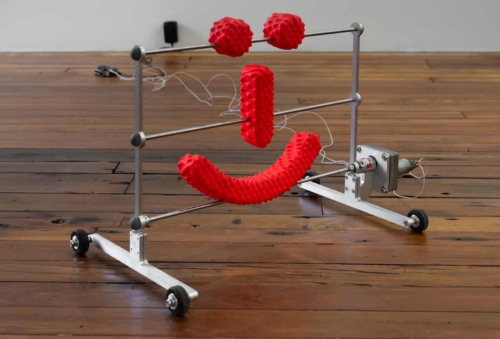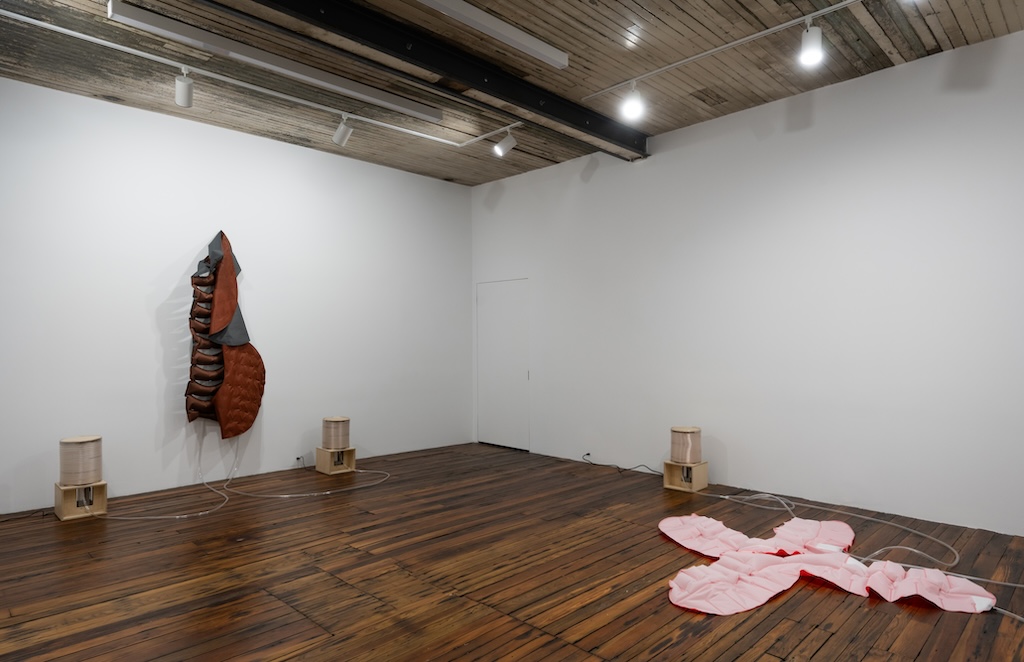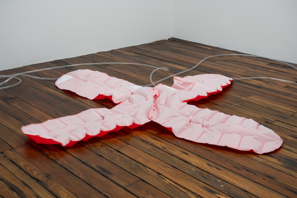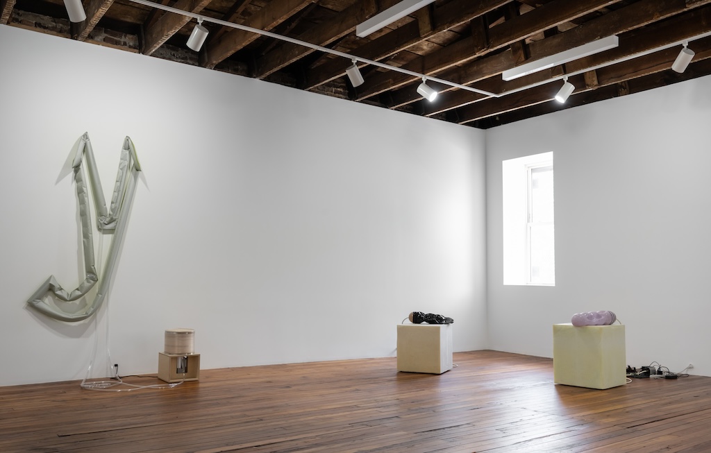 Catala pushes on both intellectual and emotional levers throughout the exhibition, but I was most affected by two works that strongly conjured the vulnerability and strangeness of the human body. One, made in 2018, presented the letter “A” as a quivering rubber pancake attached to electrical wires. Diminutive in comparison to Catala’s inflatables, the “A” lay askew on a clinical stand. The small form’s trembling placed it at risk for sliding to the floor…the start of our alphabet and the first step of preschool reading lessons was on the verge of tumbling to its end.