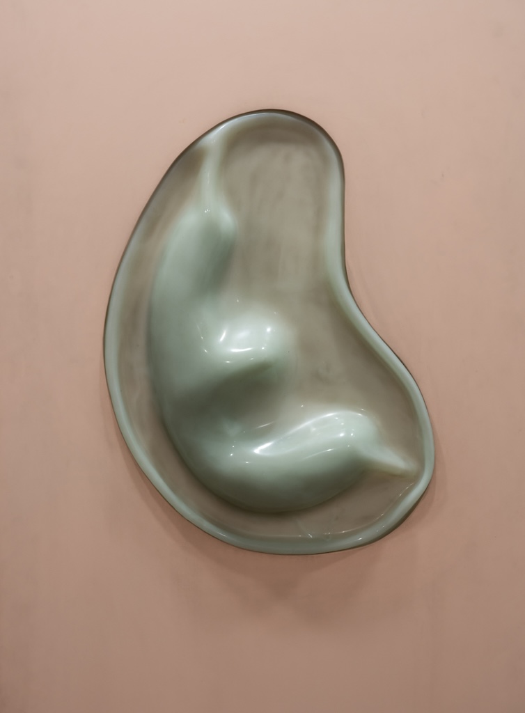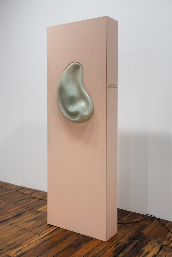 The final work, a bruised pink monolith installed on the ground floor, struck me even more viscerally. As a refrigeration unit violently hummed, a torso-sized beige bean implanted in the column rumbled; its shell collapsing inward for several seconds to reveal the exaggerated contours of a human embryo. While not fully successful in compressing the awesome and abject qualities of pregnancy and gestation into a single visual statement, this piece did chillingly suggest the way that even such a private, deeply pre-linguistic state is already politicized, not only because of conflict over reproductive rights (which has become only more dire since the piece was made in 2014) but because the embryonic body it represents will inevitably be born into a socio-political landscape that constrains what it can become.