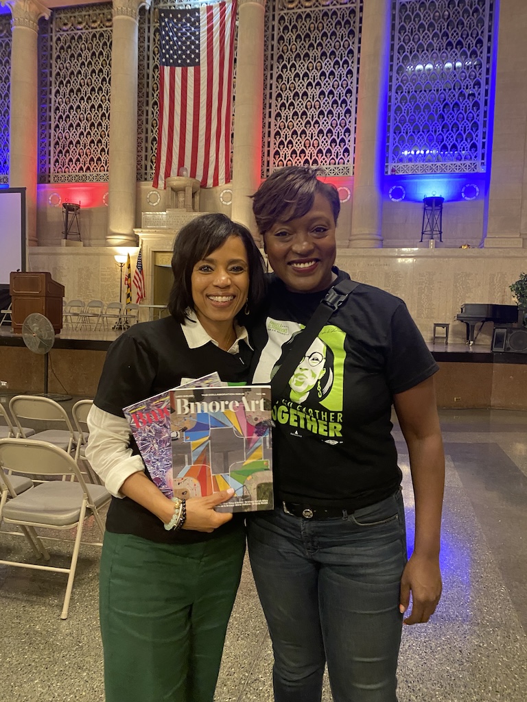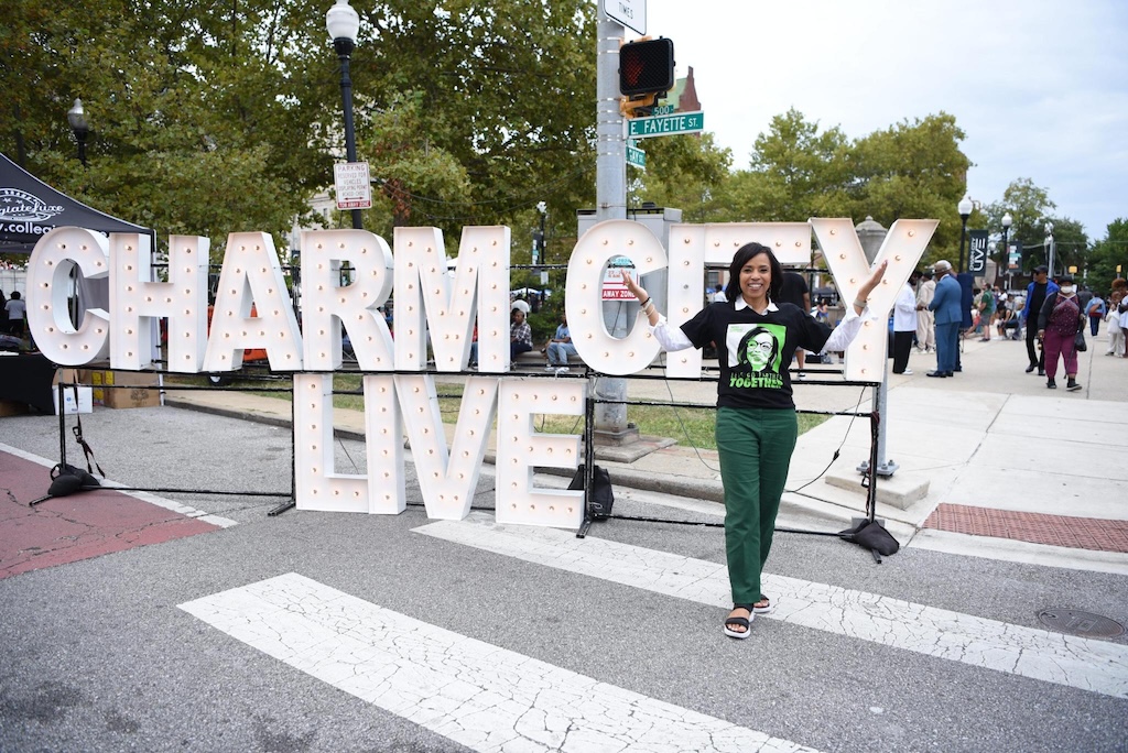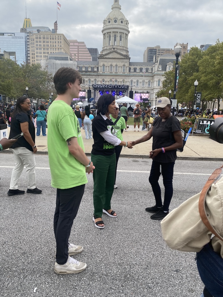On Saturday, September 21, I am thankful for the bold visibility of chartreuse. Upon arrival at Baltimore’s Charm City Festival, invited by the Alsobrooks campaign to conduct an interview, the popular outdoor event is overwhelming. There is a stage with giant screens in front of City Hall, crowds dancing, food vendors cooking, and kids playing a variety of carnival games. Worried that I will miss my window of time with Alsobrooks, who is on a tight campaign schedule, it was chartreuse that saved the day.