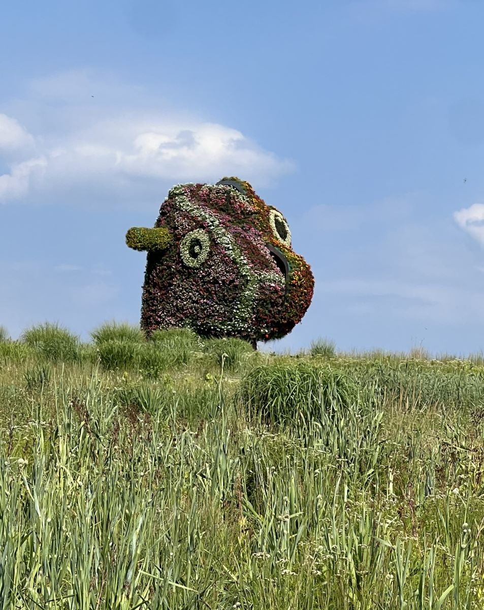 Paris drove us through winding Potomac streets lined with mansions that seemed to have sprouted like ostentatious mushrooms in the years since I’d been in that part of town. The road was edged with lush forest, and I almost didn’t notice the entrance which just seemed like another driveway. Soon after entering the property, though, the magnitude of the museum became apparent. At nearly 300 acres, Glenstone has quite a footprint. We could see the Jeff Koons sculpture, “Split-Rocker,” a 36-foot-tall hobby-horse head fashioned from flowers, looming from our parking space.