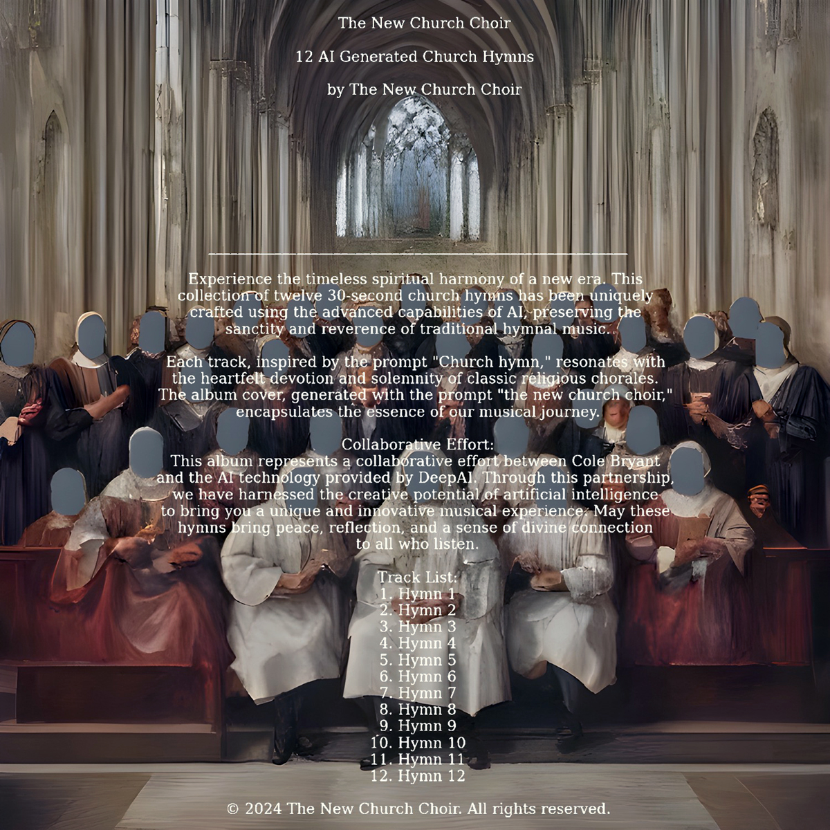 Cole Bryant, "12 AI Generated Church Hymns" Album Cover created with DeepAI.org and ChatGPT and arranged in Adobe Illustrator.