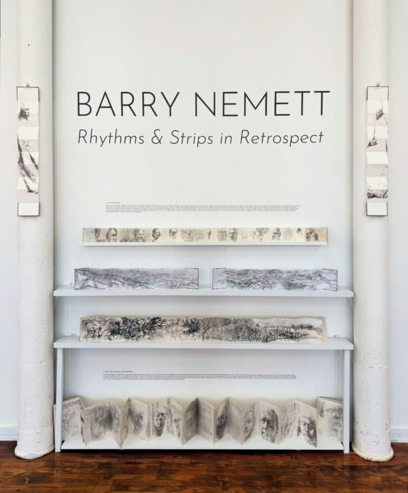 Whether in graphite, ink wash, or ballpoint pen, the procession of images literally unfolds in a series of accordion-paged books: forests, rooftops, mountains, farmland, rivers, clouds, birds, monkeys, skulls, transcriptions of master paintings, and sculpture. There are also the abundant faces of family, friends, and students. Nemett, 77, taught thousands of drawing and painting students in his 50-year career at Maryland Institute College of Art. Sometimes the likeness appears and sometimes it doesn’t. Nemett seems unfazed by this. He knows that in fifty years, it won’t matter.