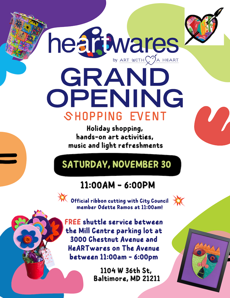 Just in time for the start of the holiday shopping season, Art with a Heart (AWAH) will host the grand opening of HeARTwares, its social enterprise store located on The Avenue in Hampen, at 1104 W. 36th St., Baltimore, MD 21211.