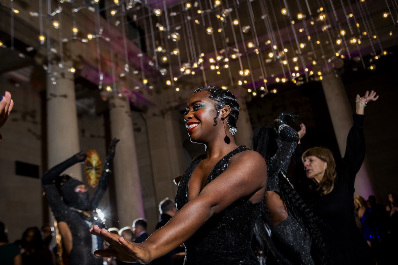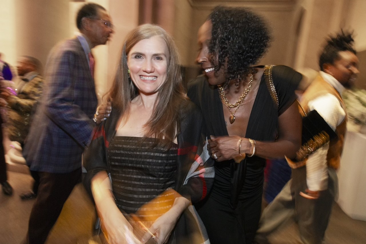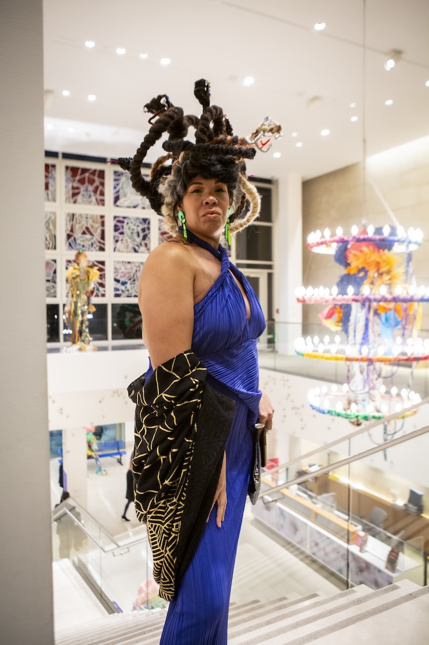 I arrived early, wearing a black party dress and large, asymmetrical Nikki Couppee earrings—my favorite wearable art. It was already dark as I ascended the grand front steps of the museum, passing two dozen young women in metallic green puffy jackets and white tights, part of the Twilighters Marching Band performing outside. The street was quiet, with the exception of a group of valet attendants hopping about, keeping warm and waiting for more cars to arrive.