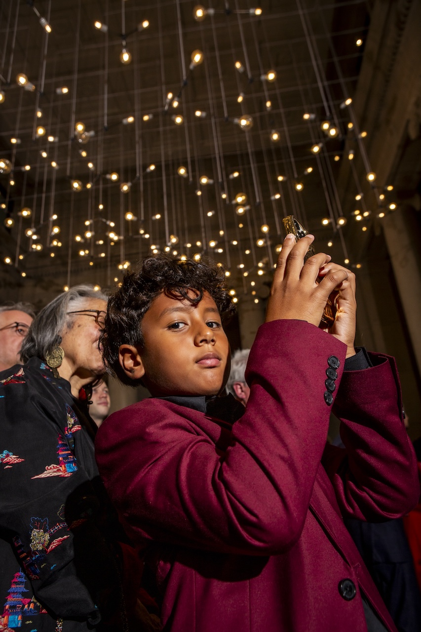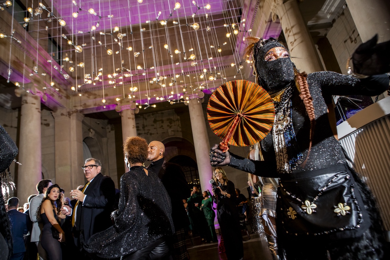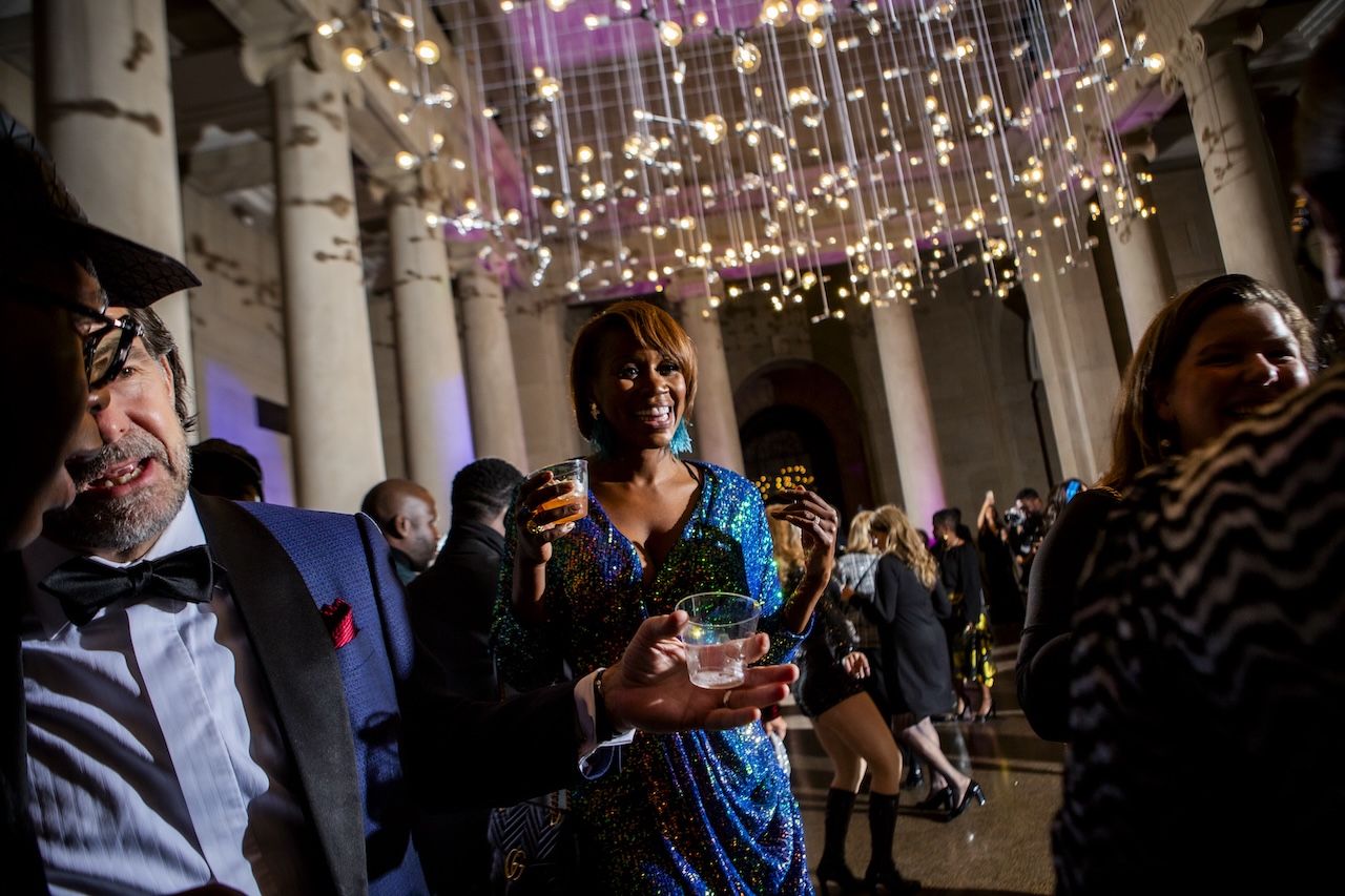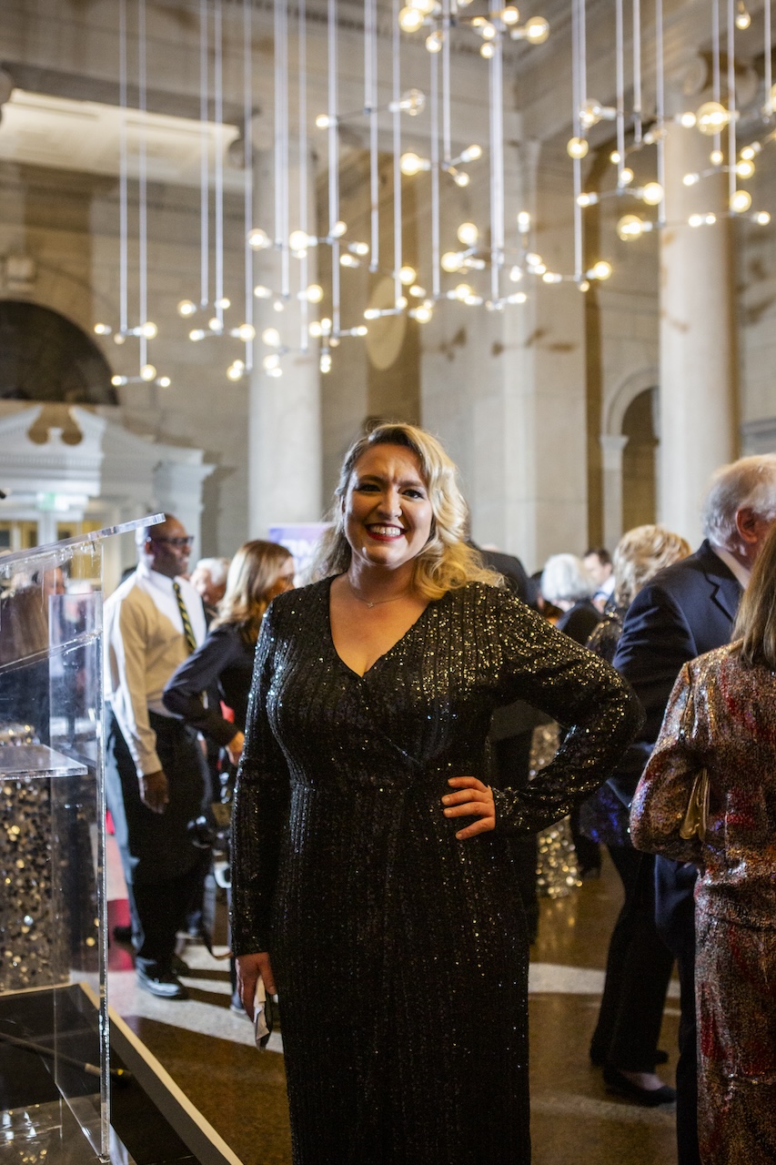 I arrived early, wearing a black party dress and large, asymmetrical Nikki Couppee earrings—my favorite wearable art. It was already dark as I ascended the grand front steps of the museum, passing two dozen young women in metallic green puffy jackets and white tights, part of the Twilighters Marching Band performing outside. The street was quiet, with the exception of a group of valet attendants hopping about, keeping warm and waiting for more cars to arrive.