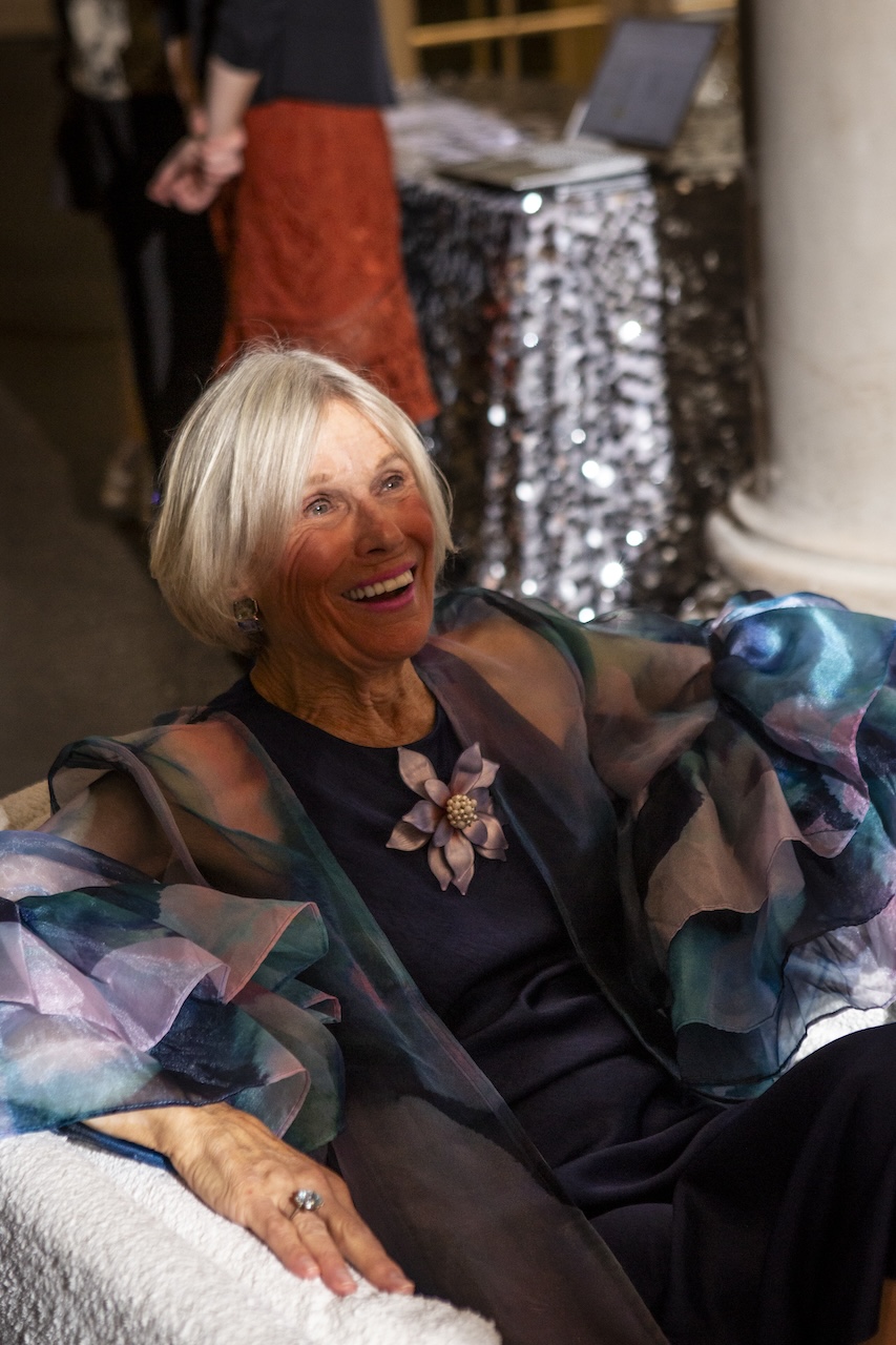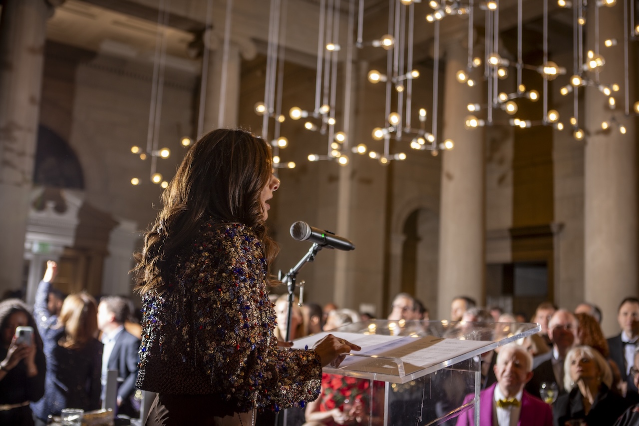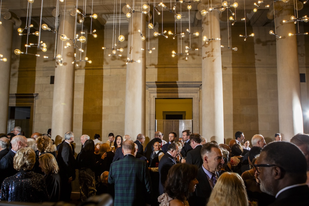 Normally, visitors to the BMA enter through the side Zamoiski entrance near Gertrude’s, but tonight was special—the 110th Anniversary Celebration. So, we walked up the grand front staircase, through massive doors, and into the Fox Court, which was filled with 150 sparkling chandeliers, the stunning modernist sculpture by Spencer Finch, titled Moon Dust (Apollo 17). The installation, first presented at the 2009 Venice Biennale, consists of 417 lights and creates a starry, swoon-worthy atmosphere. The hallways around the court are lined with Antioch mosaics and Rodin’s The Thinker, setting the perfect scene for an event that raised $1 million to support artistic and educational programs, including the Turn Again to the Earth environmental initiative.