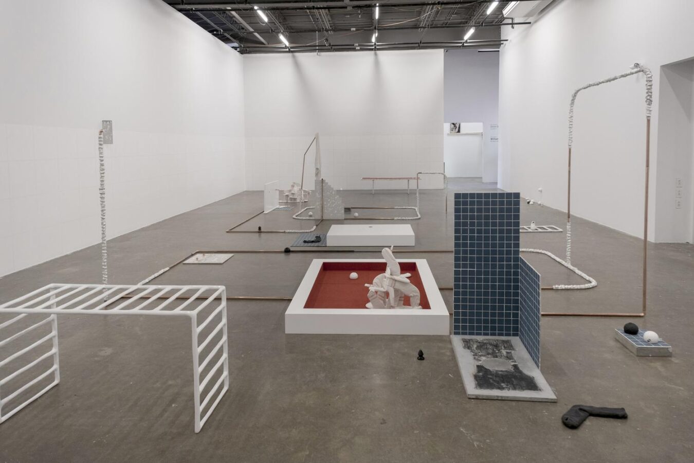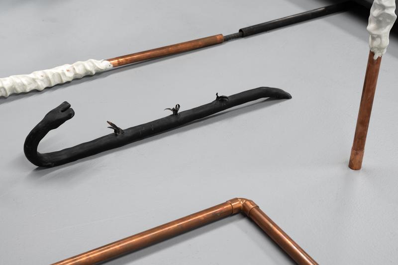 The conflict of private and public selves is evident in Doughtie’s earlier work as well, whether through high- lighting the gaps of bathroom stall doors (“Stall Game,” 2019) or, more metaphorically, using teeth to create the sense of danger one might feel in such spaces (“With Teeth, The Fox, He Comes,” 2019). “In Anticipation” (2019), the viewer is presented with the barest sketch of a space: a few black- tiled panels, rendered in acrylic paint, are hung on one gallery wall while another freestanding, white-tiled square “looks on” from across the room. Copper pipes snake into the air as if allured, mesmerized. The title of the work suggests a wait that is part thrill, part dread—which makes the alignment/misalignment of potentially penetrative objects and more orifice-like structures of Anticipation all the more agonizing. Of course, where agony can be found, there is also the potential for ecstasy.