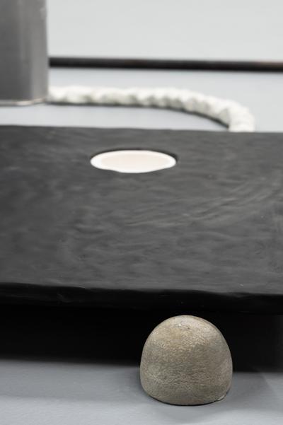 Doughtie’s most recent piece, “Tomato” (2023), shown at the Museum of Contemporary Art Arlington, uses many of the same visual tropes as “Locker Room” but raises some additional questions. The title suggests an organic subject, but the color palette is industrial—black, white, copper, and aluminum. A cutaway drawing of a tomato would show skin, placental tissue, and seeds; Doughtie’s “Tomato” shows navel oranges cast in white plaster, a copper pipe partially wrapped in resin that drapes over a black platform like a string, and a scattering of crowbars sprouting calyces (the protective enclosures of flowers before they bloom). What do we choose to label as organic or inorganic? Natural or unnatural? Is “Tomato” a case of mistaken identity, a fruit taking on the title of a vegetable? Or is all this taxonomy a red herring?