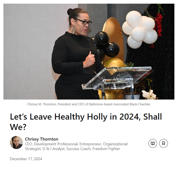 Chrissy Thornton, President and CEO of Associated Black Charities (ABC), has issued a powerful response to the media following a recent local media article in the Baltimore Brew that inaccurately reported on a duplication of a grant approved by the Baltimore City Council for ABC. In her opinion piece, titled “Let’s Leave Healthy Holly in 2024, Shall We?”, Thornton calls attention to the harmful impact of outdated narratives and biased portrayals of Black leadership, while highlighting the need for accountability and balance in media coverage.