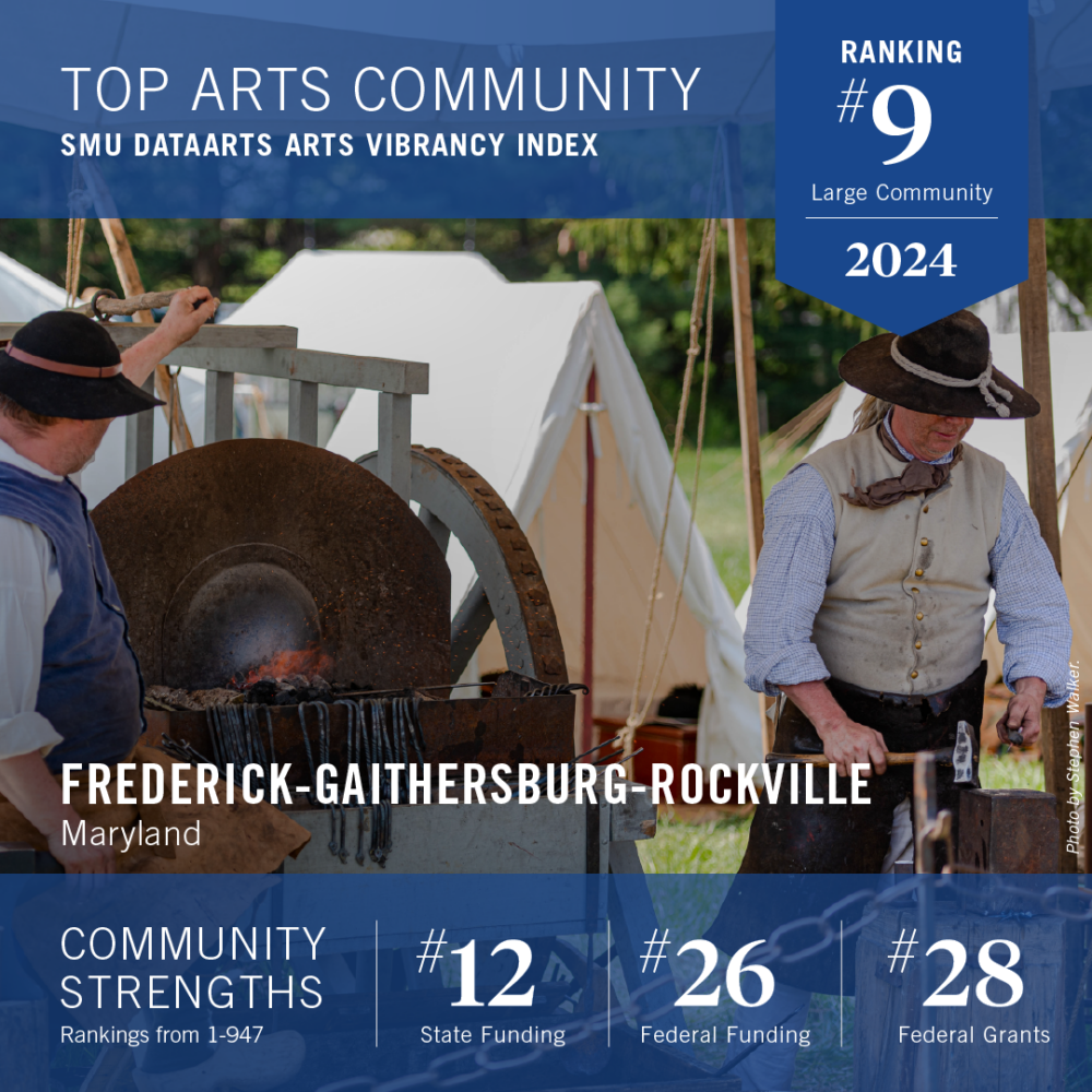 SMU DataArts, the National Center for Arts Research, released its annual ranking of the 40 most arts-vibrant communities in the United States, organized into three separate lists based on community size, which identifies Frederick-Gaithersburg-Rockville as number 9 in the list of 20 Large communities in the United States. The list is based on their 2024 Arts Vibrancy Index, which is developed through a data-driven approach that analyzes the level of supply, demand, and government support for the arts using data available in more than 900 communities across the country. Frederick, along with its neighbors Rockville and Gaithersburg has consistently appeared on the Arts Vibrancy Index since the launch of the rankings in 2015. This year, the Frederick-Gaithersburg-Rockville area is ranked ninth on the annual list of the 20 most arts-vibrant large communities in the nation.
