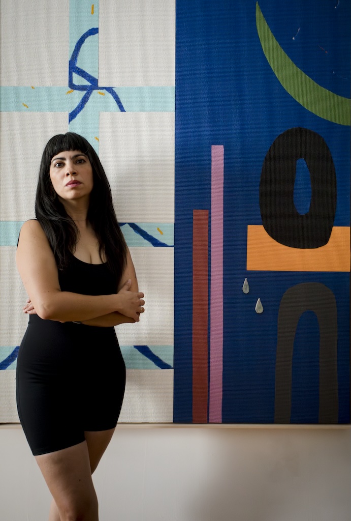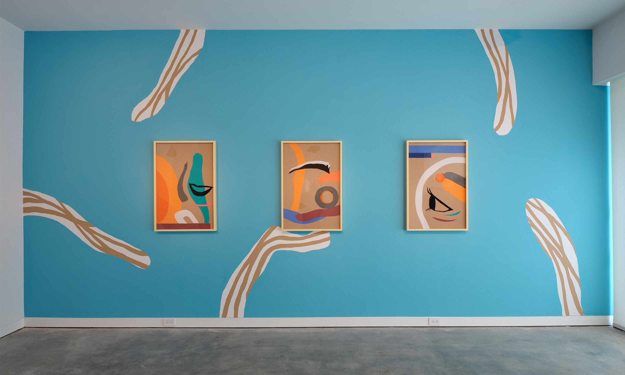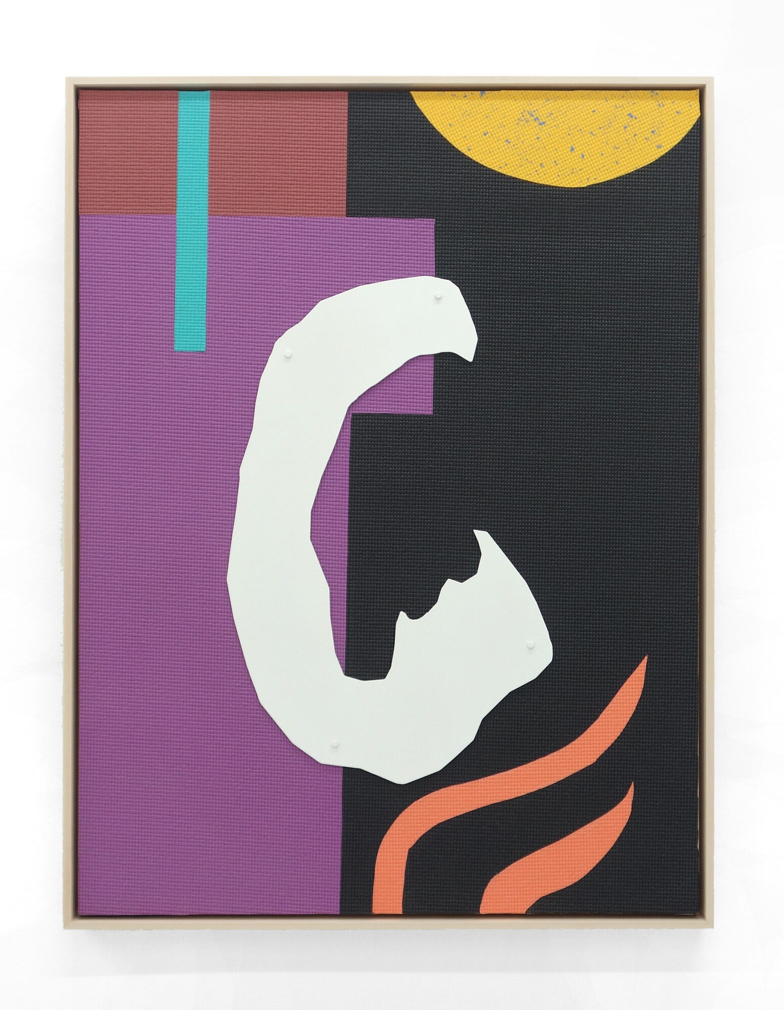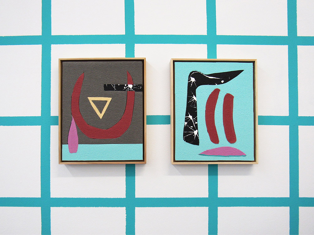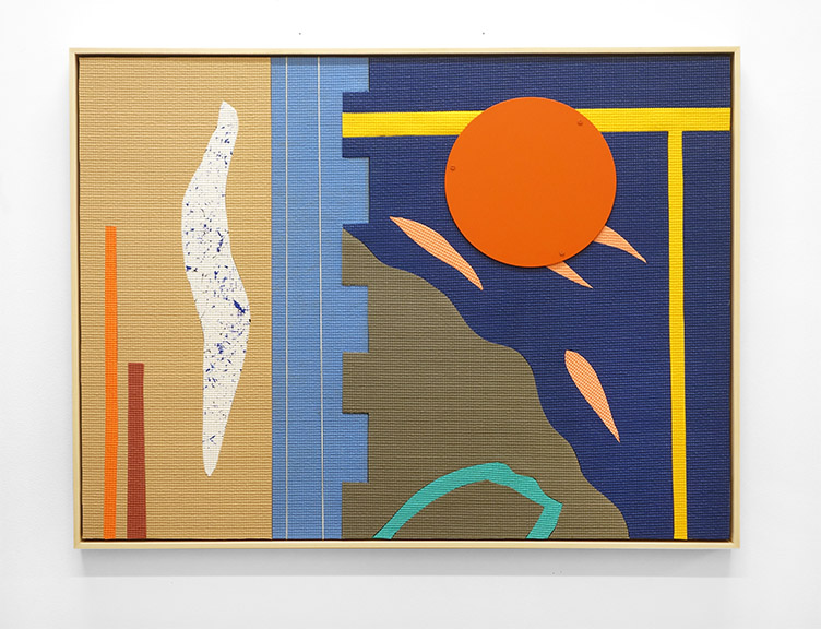 There’s a seductive, graphic quality to many of Ebstein’s colorful “paintings” that travels well as a PDF. Viewed as crisp photos on a glowing screen, their organic forms evoke crowd-pleasing 20th-century stained glass. Or, printed in miniature on an exhibition checklist, they could be fabric swatches for Marimekko prints I’d desperately want to be draped in. But being physically present in front of one of her human-scaled works at her recent Current Space solo show, I imagine the pleasant surprise of a European curator uncrating one for the first time. They are decidedly not images—they are rich assemblages of apparent materials and curious textures that deliberately remind the viewer of their object-ness with a knowing wink and clever, unexpected details. Look closely and you might spot a hint of the artist’s thumbprint in a tiny ceramic charm, or a grid of hand-knotted twine superimposed over a print-like composition—reversing the surface-decoration/support relationship between “textile” and “pattern.”