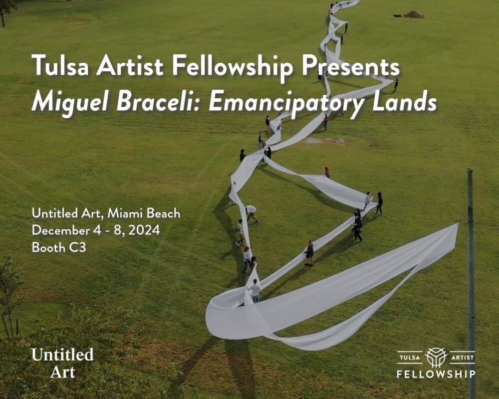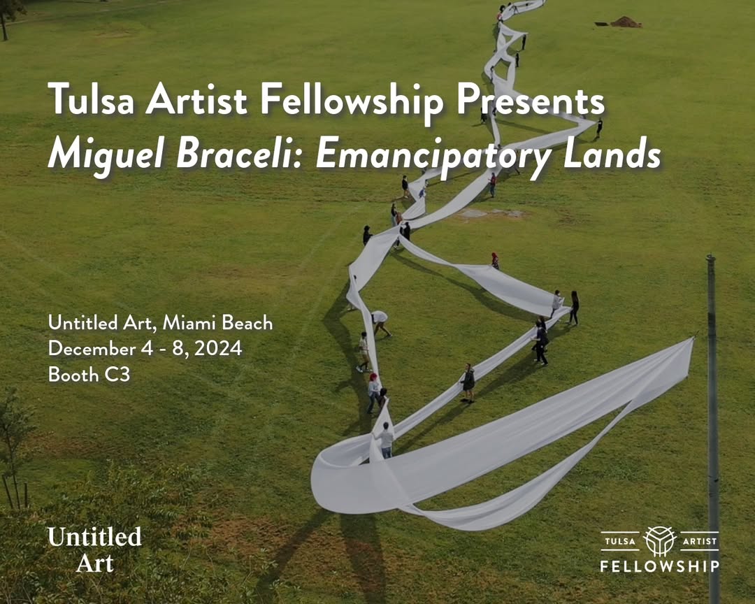 We’re pleased to see that 2020 Sondheim Prize Finalist Miguel Braceli (read BmoreArt’s interview with the artist here) is showing at Untitled through the Tulsa Artist Fellowship in booth C3 with timely works that confront ideas of nationalism and geopolitics. Braceli will also be speaking on a panel in the Untitled Podcast Lounge at noon on Wednesday, Dec 4 about La Escuela, a trans-national art and education initiative.