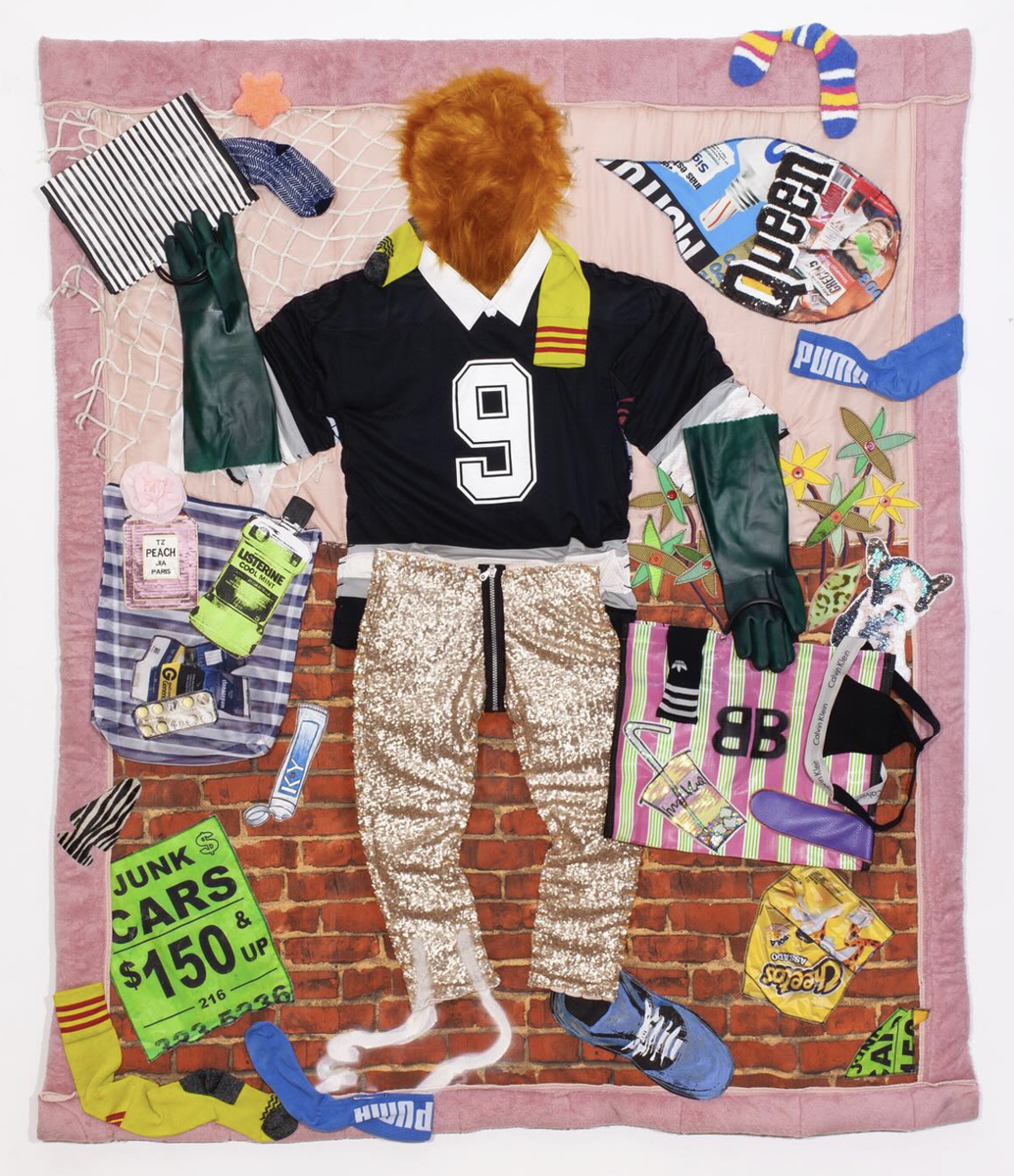 Randolpho Lamonier, “Queer Zombie (Material Boy)” 2024. 73 x 61 inches. Clothing, plastic, rubber, buttons, painting, screen printing and photographic printing on fabric