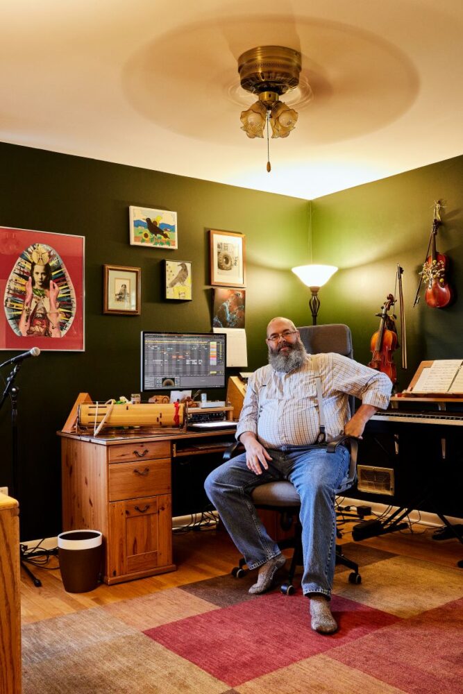 So, my interest remained just that until the COVID-19 pandemic, when I decided, “fuck-it!” I would just build some of the instrument ideas I had. The first of these was a bowed clock chime, which was just a simple soundbox to which I attached the chimes and experimented with bowing them. I’ve made several recordings with this instrument and, simple as it is, it is one I am especially proud and love the sound of. Since then, I’ve put together a workshop/lutherie in my basement and built some instrument kits: a bowed psaltery, a Stratocaster knock-off, and a kalimba.