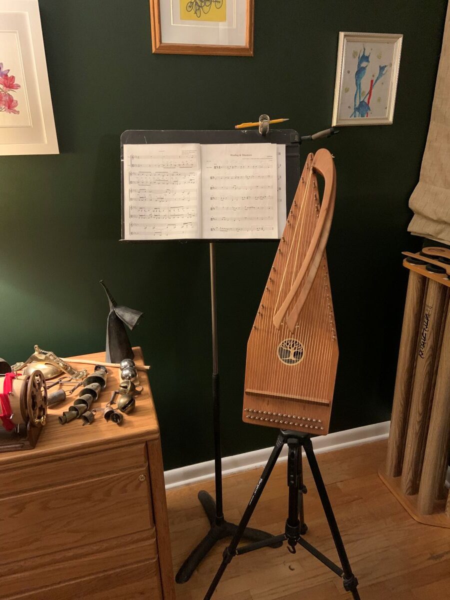 The most sophisticated instrument I’ve designed and built, so far, I call a rotola. Technically, it is a cylindrical zither with ten strings that can be tuned to the same note or differently and which has a bow that wraps around to contact half the strings at a time. It is sounded by cranking the cylinder so the strings cross the bow, rather than the conventional other way around, and is intended as a resonant drone instrument, although it can arpeggiate, depending on how it’s bowed. I spent about three years designing it and experimenting with different construction methods. My first published use of it will be in the requiem I mentioned above, but I enjoy it as a meditation aid.