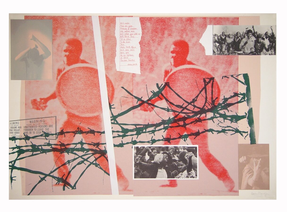 Featuring a jagged, doubled image of a young Black man wielding a stone and using a trash can lid as a shield, Jantjes’ image conveys the futile position of the students, who were confronted with a mass of police artillery. But through the use of a lively red ground, multiplied elements, and collaged photographs featuring raised hands, he also created a potent, indignant tribute to collective resistance.