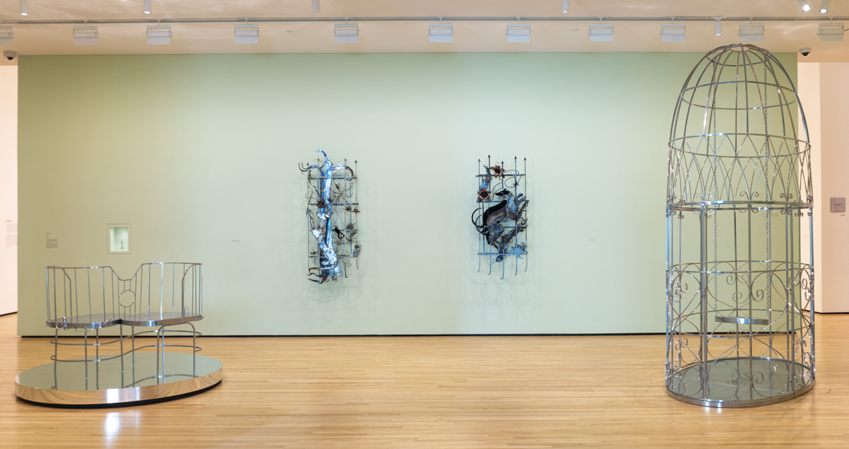 The strongest sections, located in the heart of the exhibition space, are Elegy and Groundswell. Elegy, the curators write, gathers “objects to lament the devastating impact of war and social discord.” Jamaican artist Nari Ward’s installation, “Peace Keeper,” packs plenty of emotional punch. First shown at the 1995 Whitney Biennial to rave reviews, the installation was re-constructed in 2020 and acquired by the BMA. Ward literally tarred and feathered (with peacock feathers) a massive 1980’s Cadillac hearse, which sits atop a bed of rusted automotive pipes. Above is an oppressive canopy of car mufflers.