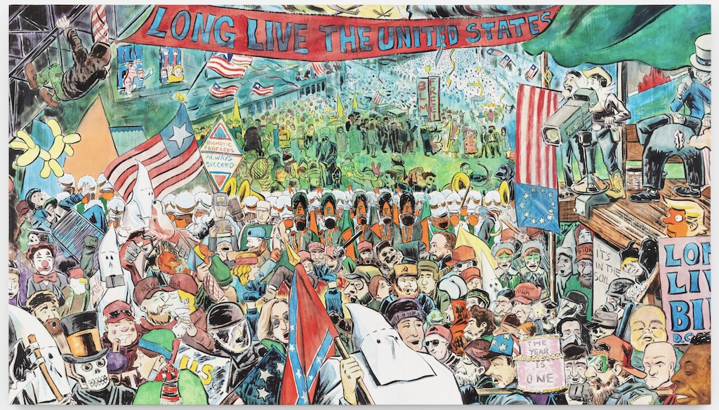 Unsurprisingly, Mark Thomas Gibson’s “Biden’s Entry into Washington 2021” remains the most popular piece in the gallery. In an image that now feels prescient, a diminutive President Biden rides a blind donkey into the capital, almost washed out in the scene’s monochrome background. On the foreground, in full color, is a teeming mass of MAGA hats, insurrectionists, hooded Klansmen, provocateurs, clowns, skeletons, and a Trump ventriloquist doll.