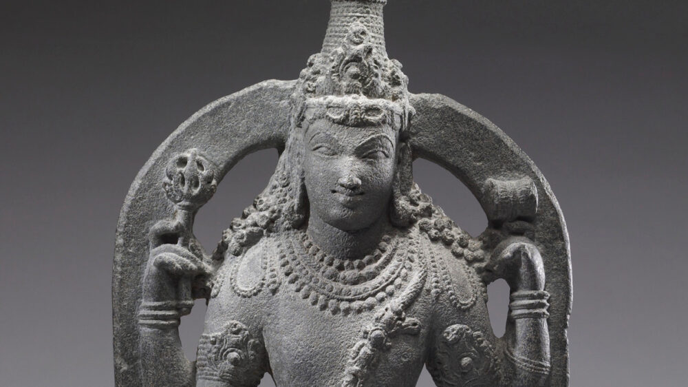 In one of Zhang’s featured works, created in response to the collapse of Baltimore’s Key Bridge, the artist weaves local materials—crab cages, chains, and concrete—into an installation evoking the elegiac beauty of impermanence. Liaretidis, meanwhile, draws from the devastating 2023 Tempi train crash in Greece: Across three large wall-mounted panels, the artist incorporates plaster, coal powder, and asphalt to create images memorializing destruction while critiquing the fragility of human infrastructure.