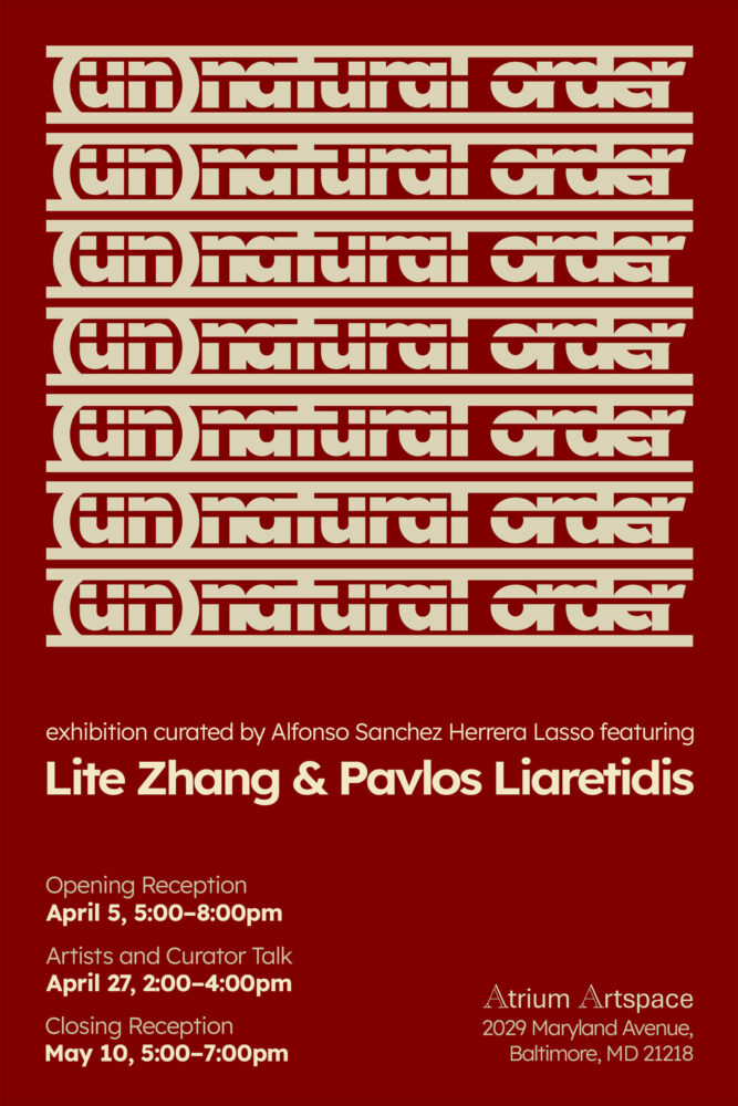 Atrium Artspace is proud to present (un)natural order, a two-artist exhibition offering poetic reflections on the collapse of man-made systems and the cascading consequences of their failures. On view from April 5 through 14, 2025, the exhibition features sculpture and mixed media installations by international artists Lite Zhang and Pavlos Liaretidis. Curated by Alfonso Sanchez Herrera Lasso, the show opens with a public reception on April 5 from 5:00–8:00pm, with gallery hours Wednesday and Thursday from 1:00–4:00pm or by appointment.