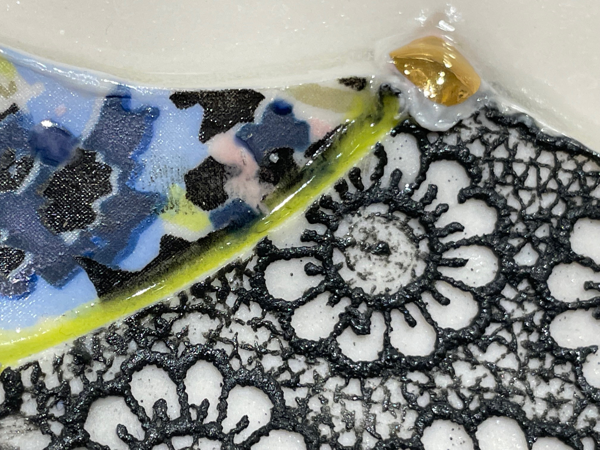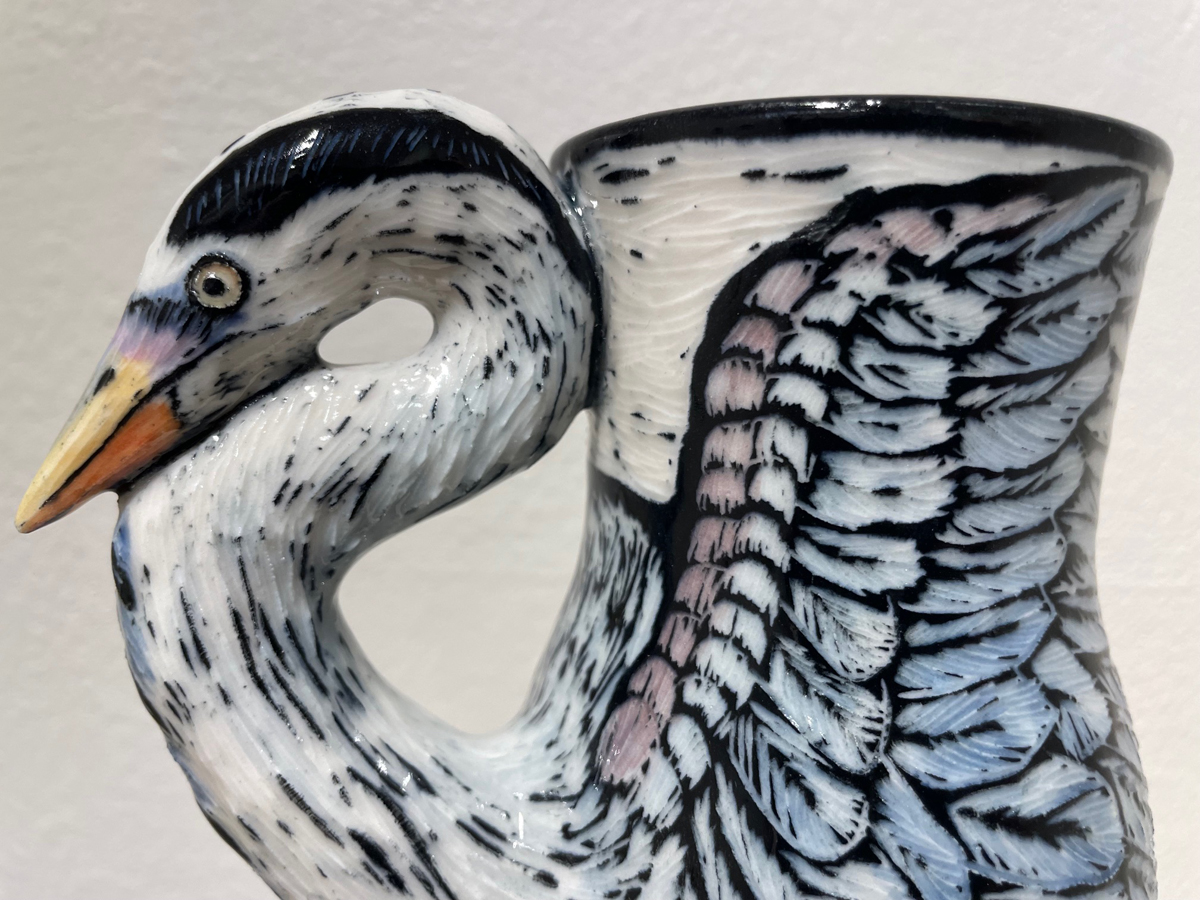 A set of drinking vessels by Wyatt Amend, for instance, nods to a thumbprint pattern found in Murano glassware, and Celia Feldberg’s dishes employ a white slip, sgraffito linework, and thin underglazes in producing a whimsical roster of appealing, loosely rendered animals.
