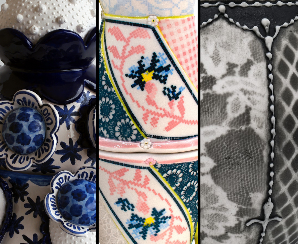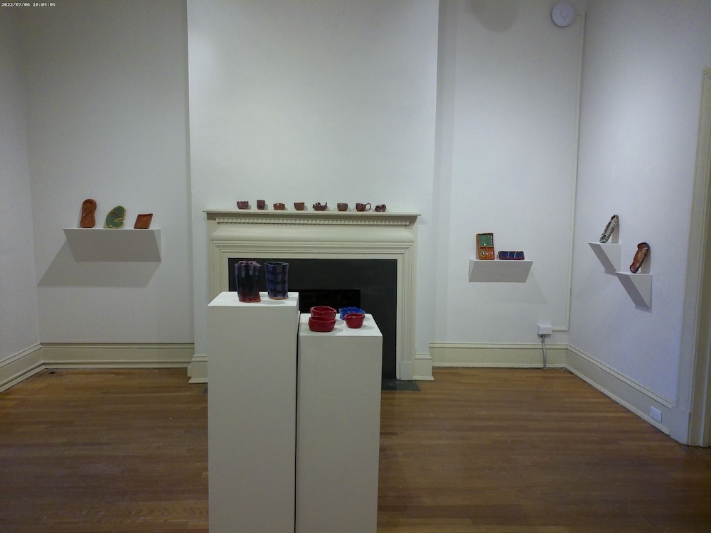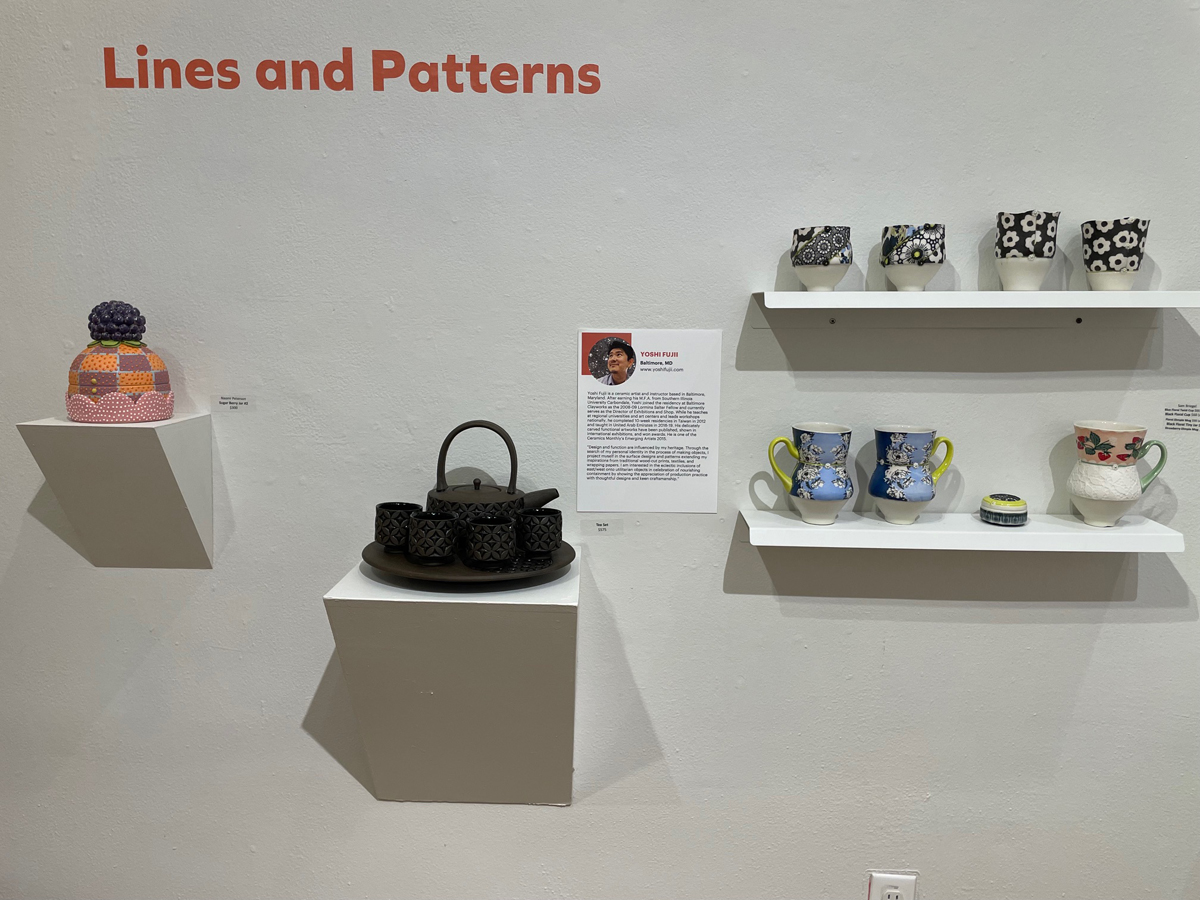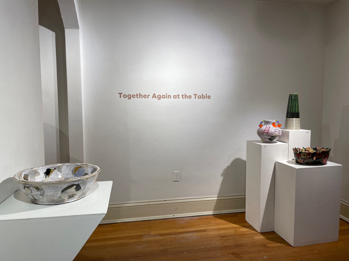 By far the largest of the three shows, Together Again at the Table features more than a hundred objects by 15 ceramists, some of them nationally recognized. Neatly installed across five rooms (and punctuated by supporting elements by Asé Design Studio and Baltimore Blossoms), the works teeter happily between dutiful functionalism and lively artistic effects.