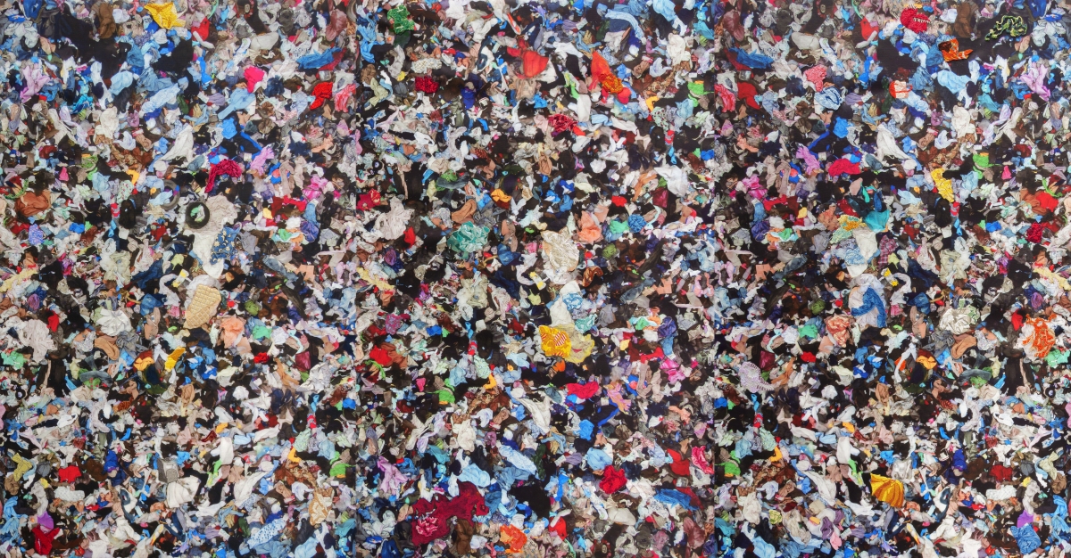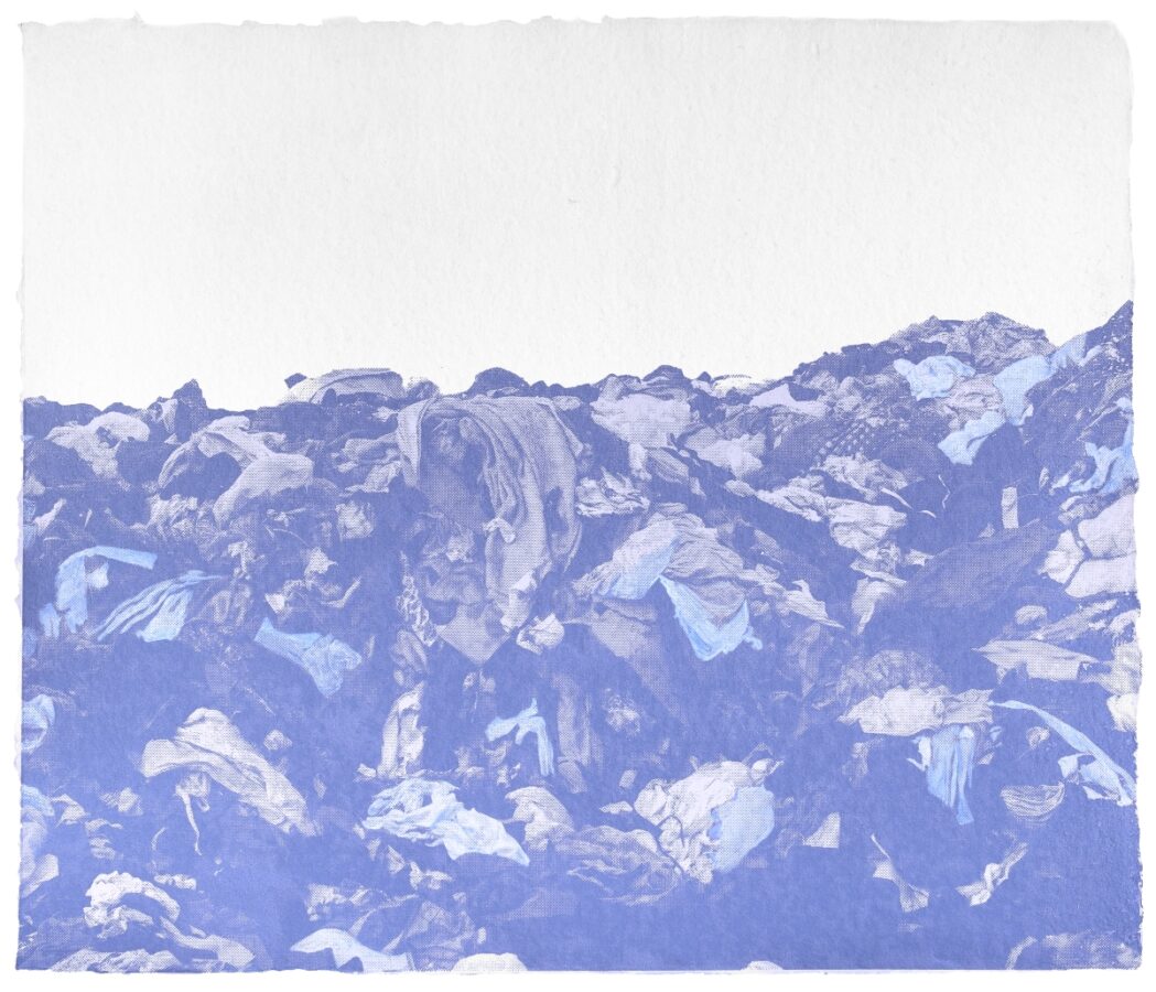 Those facts are transformed into art by an invitation to look, slowly. Using drone photography and hand-held camera work, the artist pans over 36,000 tons of textile waste brought through Chile’s Port of Iquique and dumped in the reddish dunes of the Atacama Desert on the northwest Pacific coast. The result is Fast Fashion Atacama, a video produced by the artist and her partner, the photographer and video editor, Michael Koryta. Discarded clothes appear like streams of lava and rolling mountains of trash, mottling and disfiguring the landscape like a camouflage of modernity.
