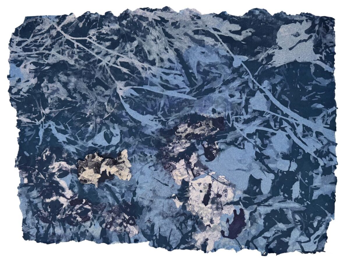 Begin with “Algae Clusters,” an elegant shock of blue on the right wall as you enter the gallery. The indigo constellations on the top left and bottom right corners recall watery wetlands harboring algae and other plant life. It also suggests a gathering of bruised petals arranged as a bouquet on a translucent surface. Under soft blue brushwork and drawings, a brown ground hovers and fades. It is a work of timeless beauty on handmade paper fashioned from recycled jeans pulp.