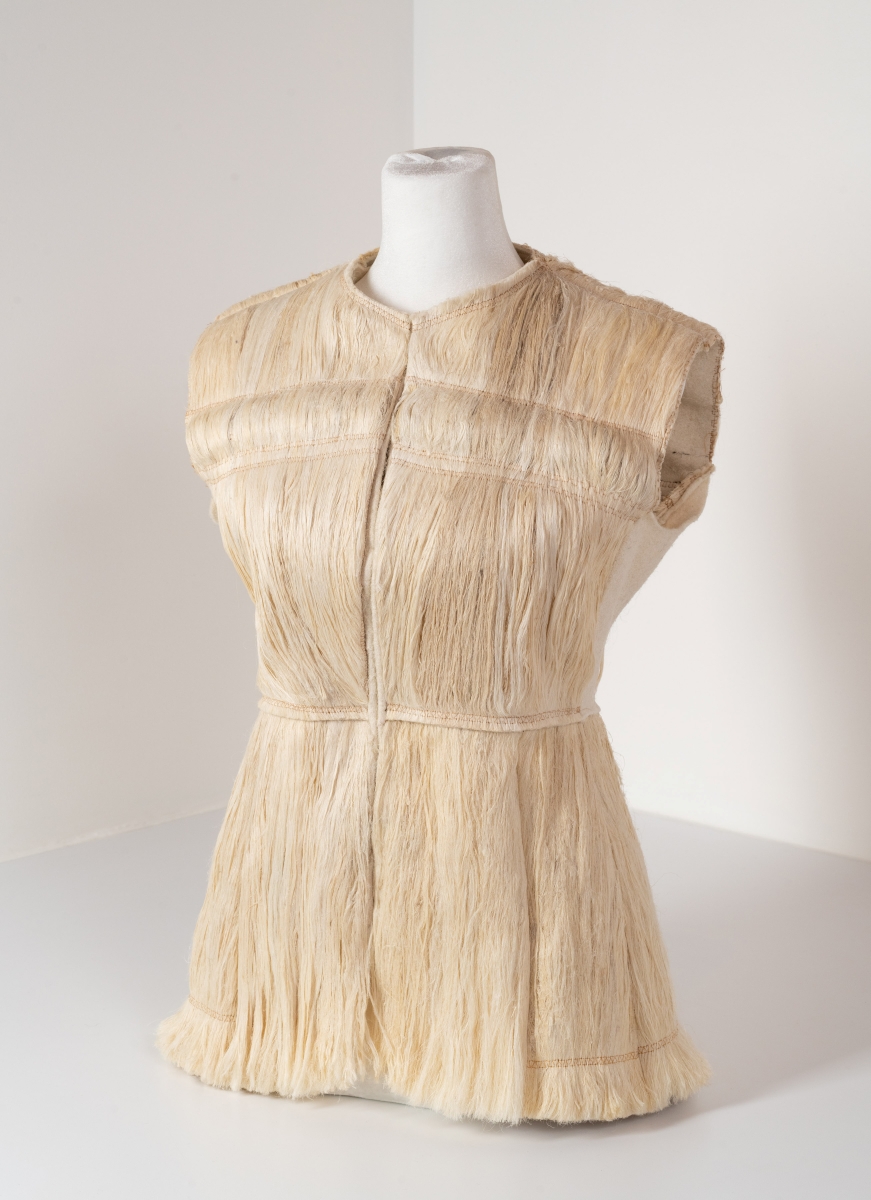 In this exhibit she calls attention to fast fashion, a moniker for cheaply produced and priced disposable clothes copied from designer brands. Between 2000 and 2020, the global production of clothes doubled to 200 billion tons. In that same span of time, the number of wears decreased by 36%, with the clothes often worn once or twice or not at all, generating 92 million tons of waste annually, according to Earth.org. Fast fashion is the second or third highest polluter in the world, behind fossil fuels and agriculture, generating more CO2 than aviation and shipping combined.