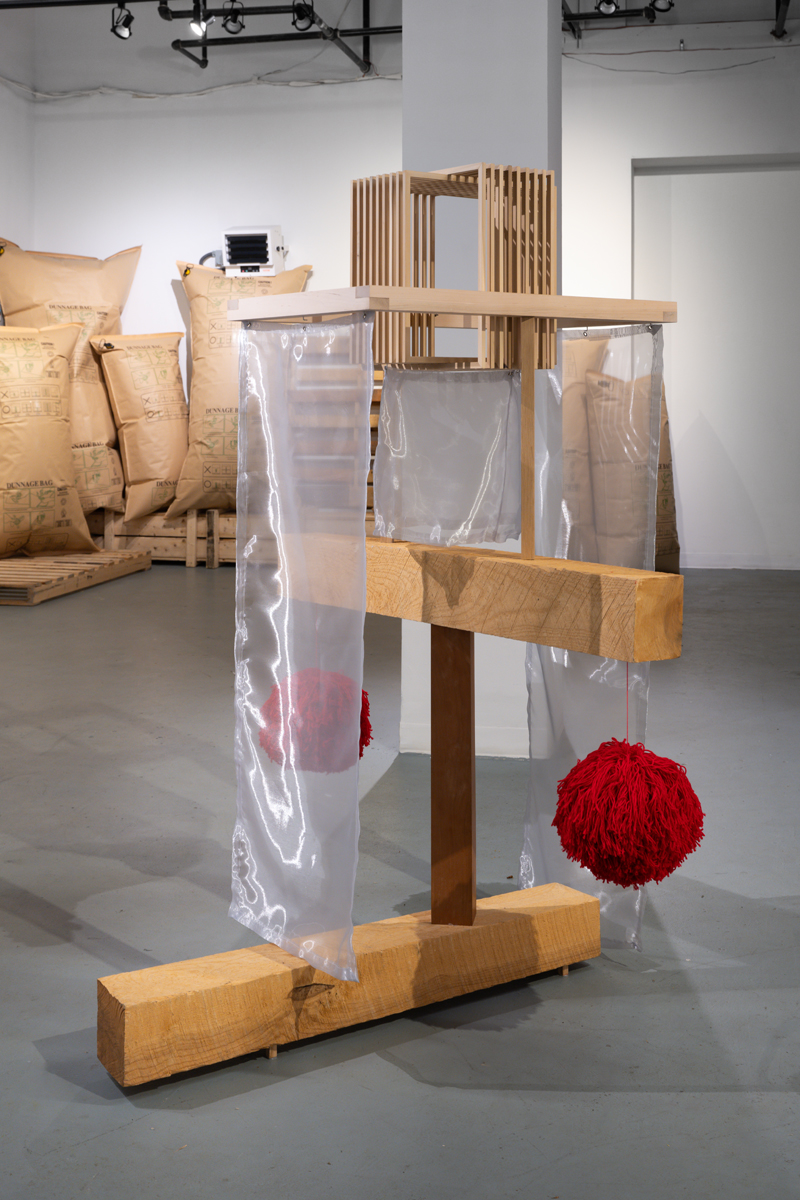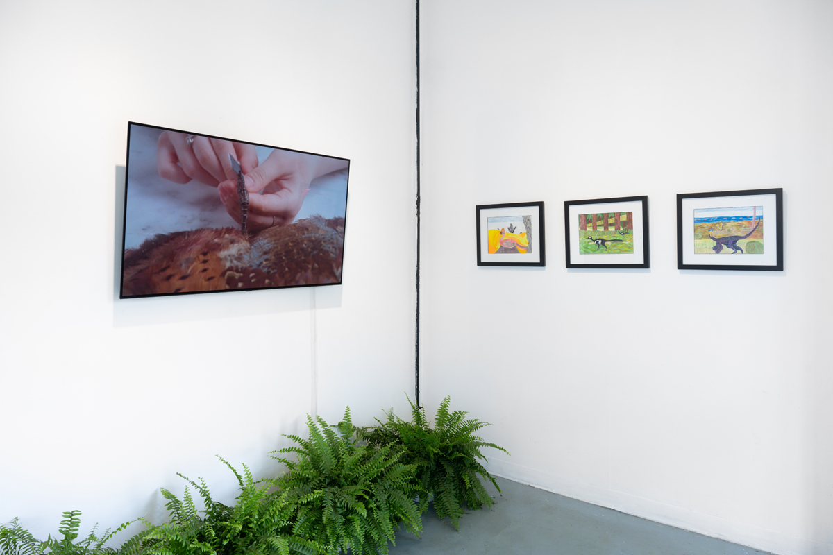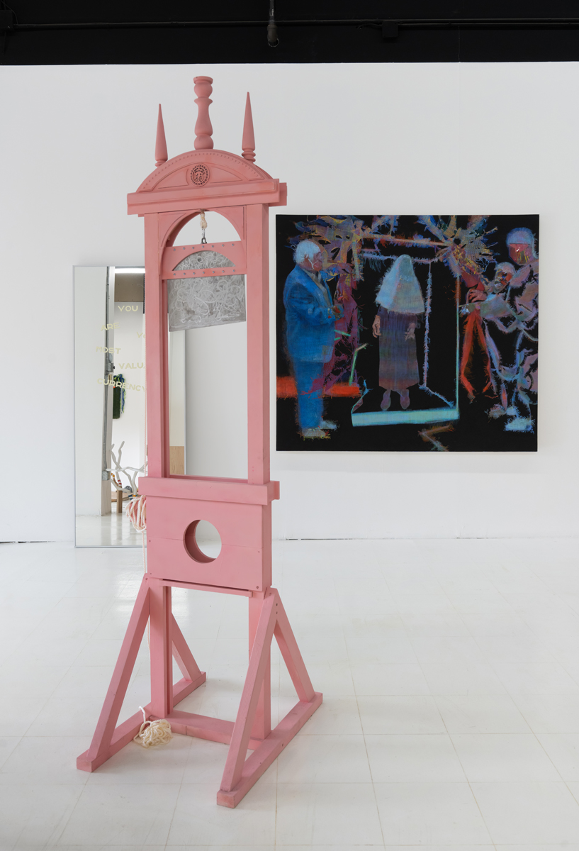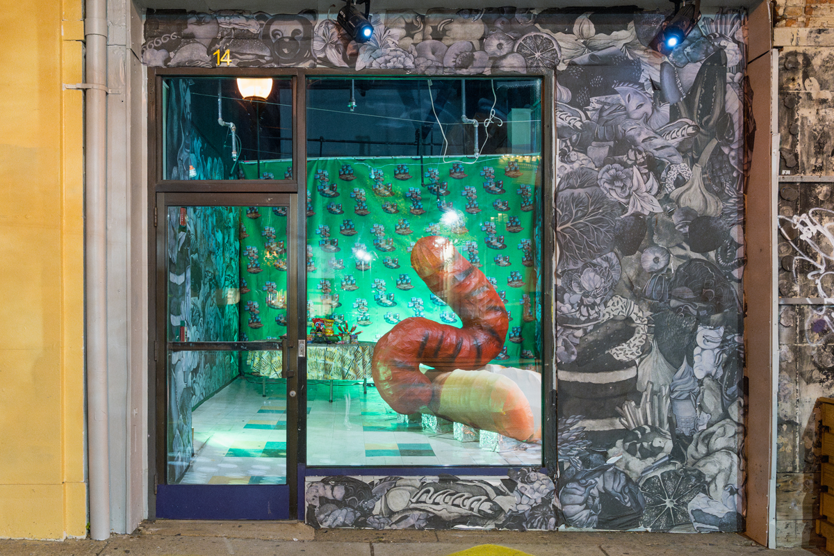 But it was mostly consensual bullying! I did ask every artist would you be okay with this? Are you okay if I install your work in this way? And then, like, how much work do you want to do? What are you okay with? What are you not okay with? And then, just having those conversations, interesting things came up about the spaces. Would it be cool to integrate artwork with clothes in Currency Studio? Having intestines going through pockets?