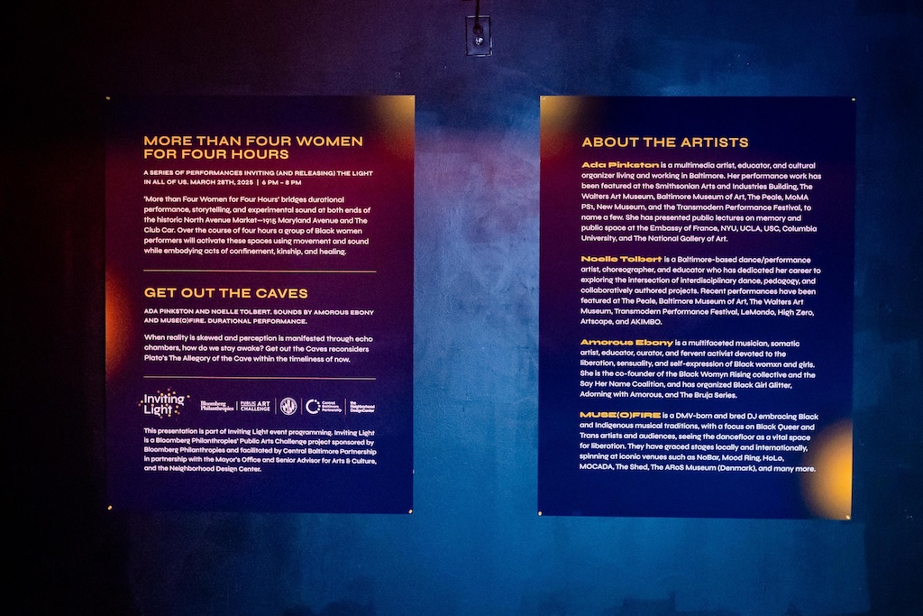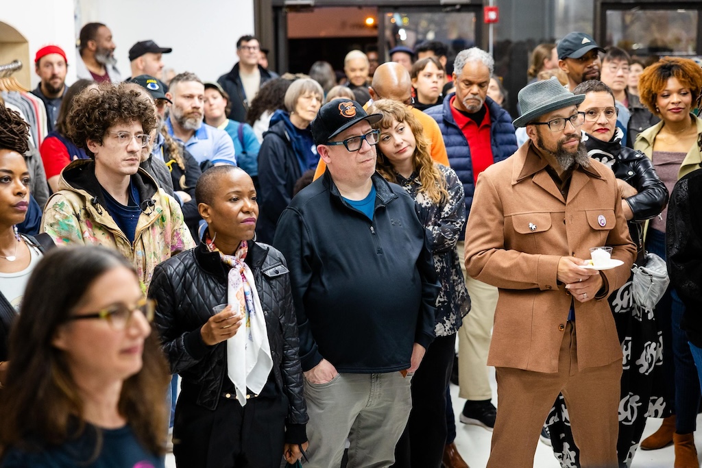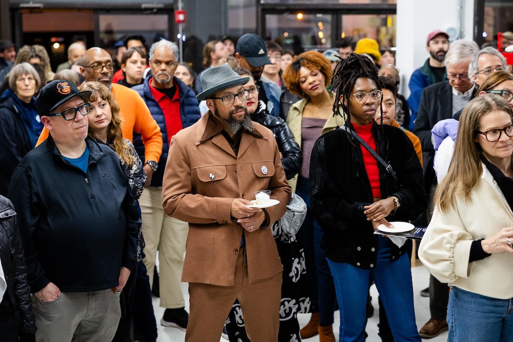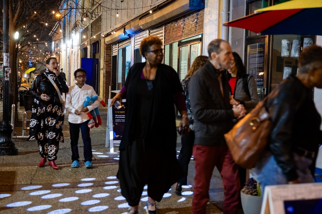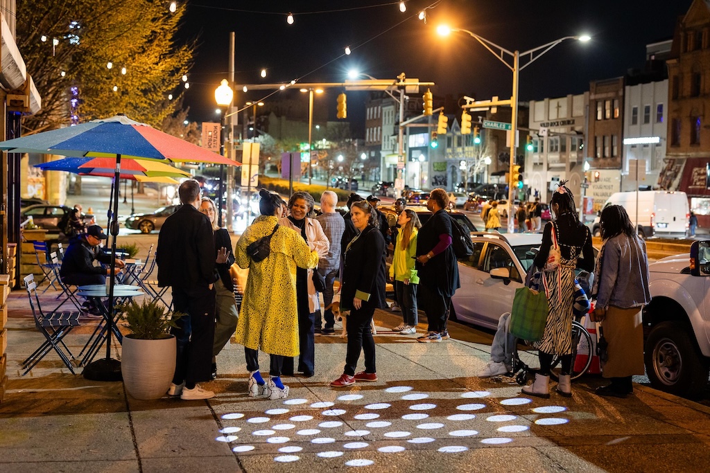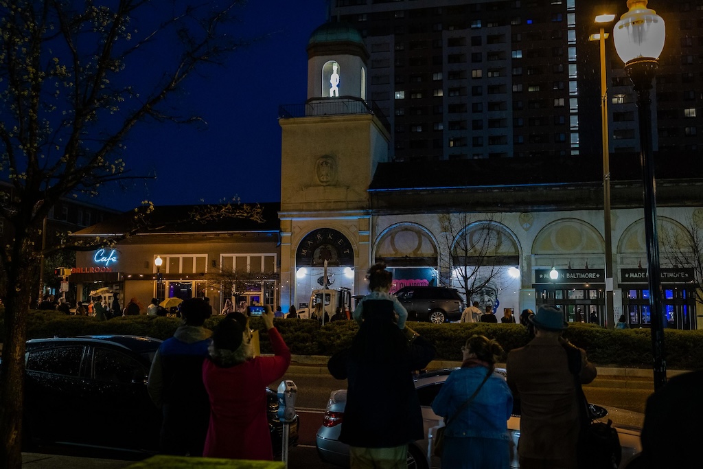 Part of the $1 million Inviting Light initiative that Bloomberg Philanthropies has funded to help revitalize the Station North Arts and Entertainment District, “Third Watch” is the first of five temporary installations that will be unveiled around the arts district over the course of 2025. A lighting ceremony for Charlton’s work at the North Avenue Market, was hosted with big crowds, programming, and performances, with the lights officially going on around 7:45.