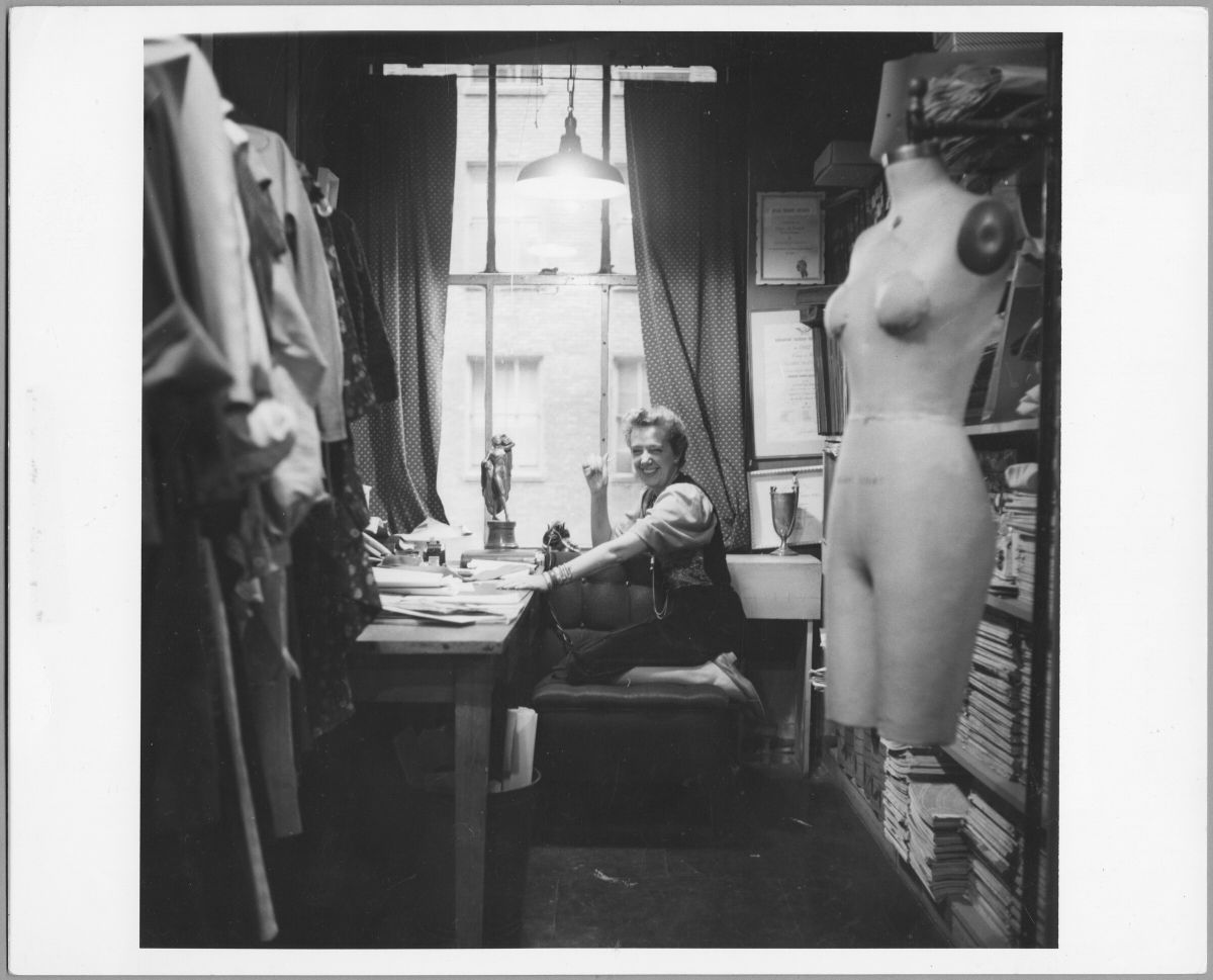 Claire McCardell at office desk, photographer unknown, ca. 1950. Maryland Center for History and Culture, H. Furlong Baldwin Library, Claire McCardell Photograph Collection, PP238.06.011