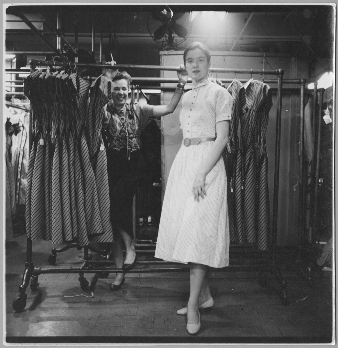 Claire McCardell behind model with rack of dresses, photographer unknown, undated. Maryland Center for History and Culture, H. Furlong Baldwin Library, Claire McCardell Photograph Collection, PP238.06.013