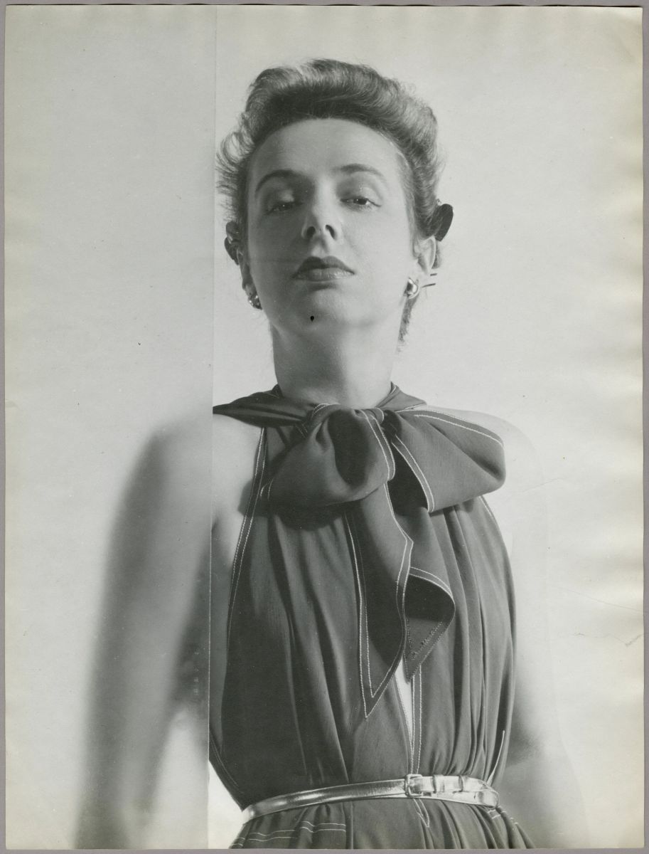 Claire McCardell modeling her “futuristic dress,” photograph by Erwin Blumenfeld for Vogue, 1945. Maryland Center for History and Culture, H. Furlong Baldwin Library, Claire McCardell Photograph Collection, PP238.11.007
