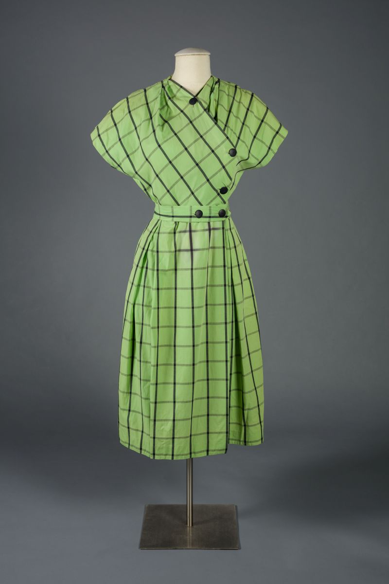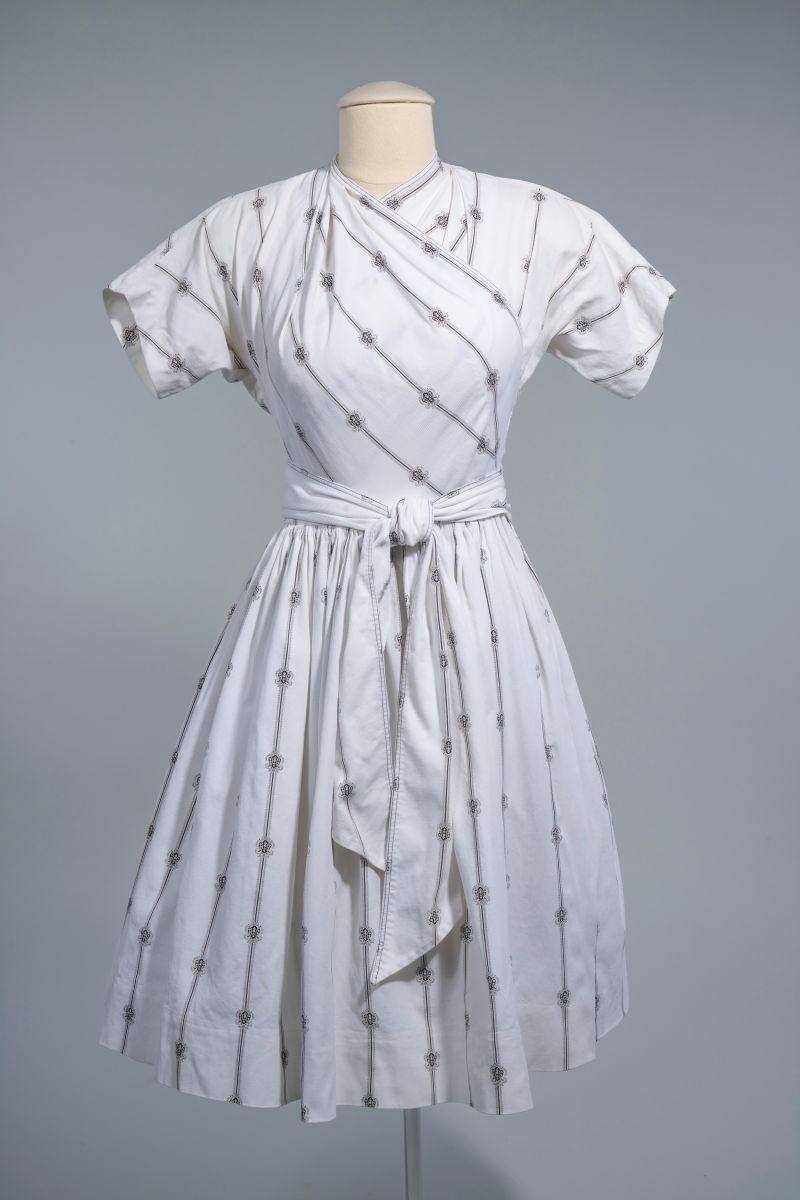 Lucky for themand usthere are plenty of McCardells on hand to share with the public. For example, the center owns multiple iterations of one of her most famous designs, the Popover. The dress, named by the department store Lord & Taylor in 1942, earned the moniker because women could simply “pop it over” whatever they had onor wear it on its own with nothing underneath. It was essentially a wrap dress, a design that is often attributed to Diane von Furstenberg, but in fact originated with McCardell.