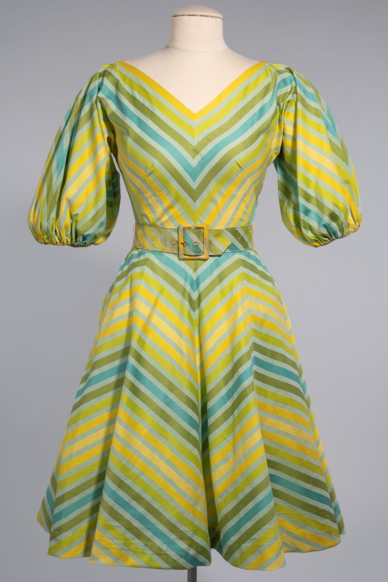 A pale green dress with bright yellow and blue chevron pattern and puffed sleeves exemplifies McCardell’s exceptional use of textiles. Dickinson notes, “Her dresses often seem simple, but are really complex in their construction, as evidenced in the use of stripes on this dress.” The pattern is modern and bold, like something from the 1980s, again showing what a visionary McCardell was.