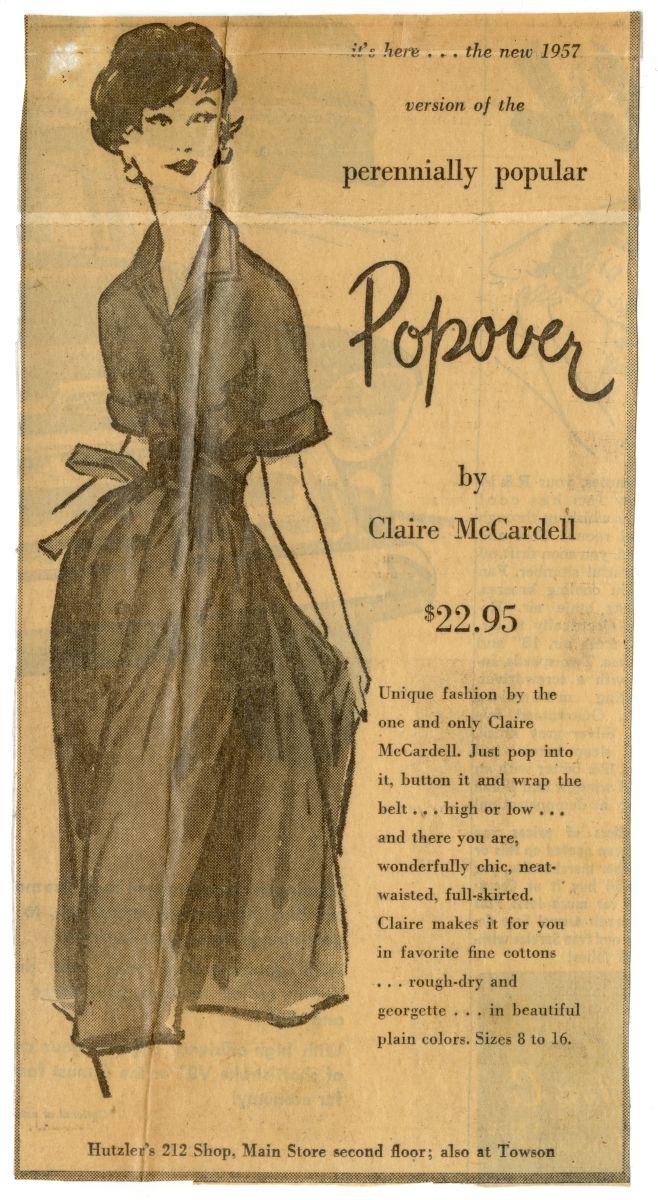 Advertisement for “Popover” dress, created by Hutzler's, 1957. Maryland Center for History and Culture, H. Furlong Baldwin Library, Claire McCardell Collection, MS 3066