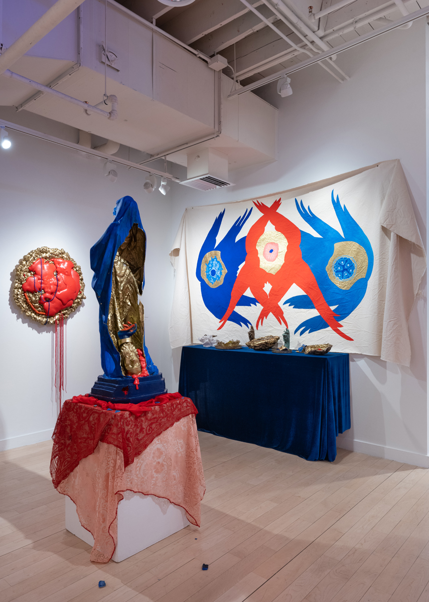 While this MacBook Pro feels animate and burdened, across the gallery, an embalmed laptop in “Portrait of Phil Caridi From Ages 30 to 39” could be mistaken for a stelae or architectural fragment. Similarly, “Portrait of Matt Piazza from Ages 24-26” appears fossilized. A sliver of metal peaks through the geologic material, curving into the familiar form of an iPhone. Part of Simmons’ series Archive of Digital Portraits Cast in Concrete, this work and the eight others in the gallery subvert the viewer’s expectations. Intentionally resembling museum artifacts, her sculptures combine obsolete personal electronic devices, “unwiped data”, and cast concrete. By mimicking the aesthetic of the fossil or artifact, Simmons offers institutional and social critique. Her work asks: what do we use, store, remember, value, and discard—and where does it go?