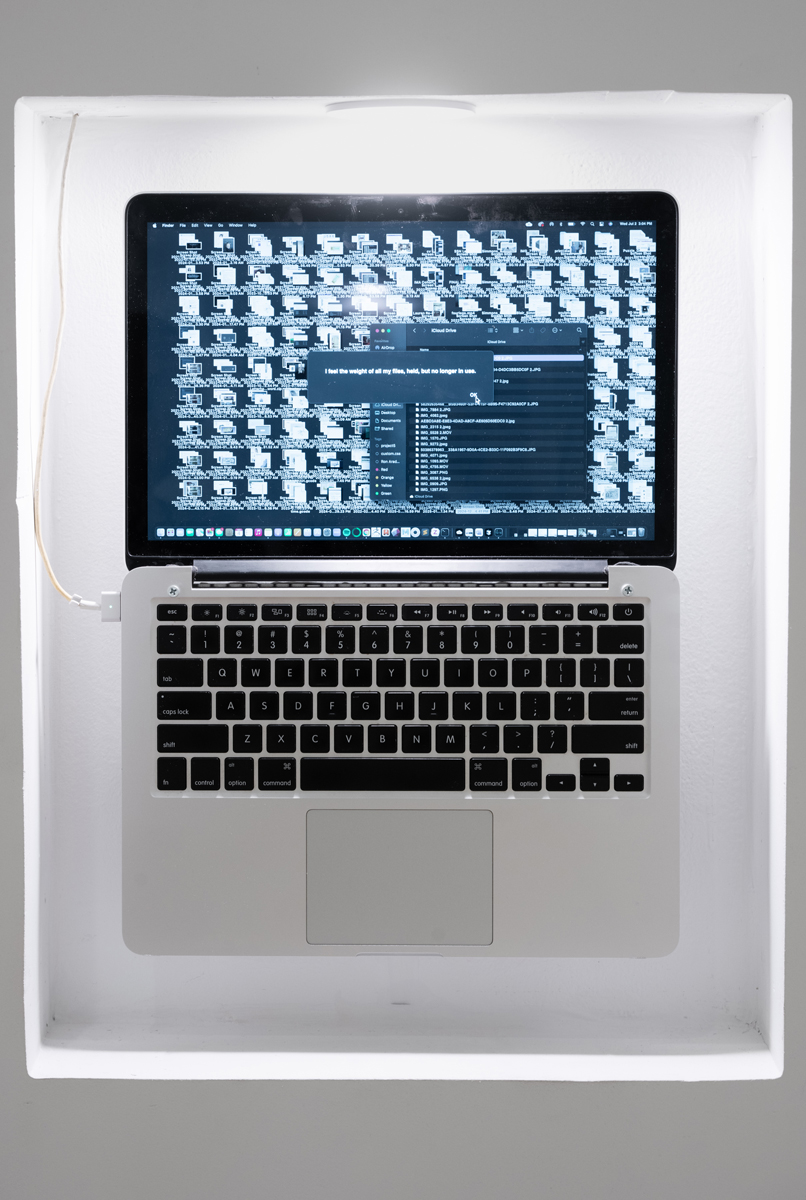 Sculptor and coder Blair Simmons finds kinship with the more-than-human world by humorously probing the limits and failures of machine memory. In “…/documents/files/memories/digitalhoard,” Simmons displays her college MacBook Pro on the wall, activating its personality through an HTML program that enables it to ask viewers for help deleting files. She explains, “I want my computer to forget like I do.” Yet the task is too great, its files too numerous.