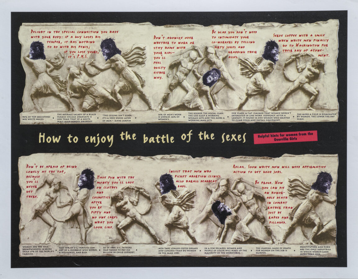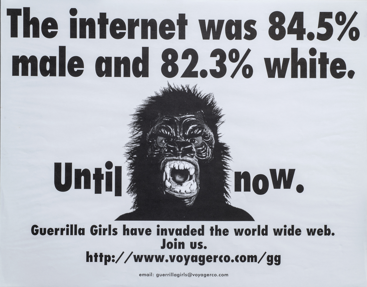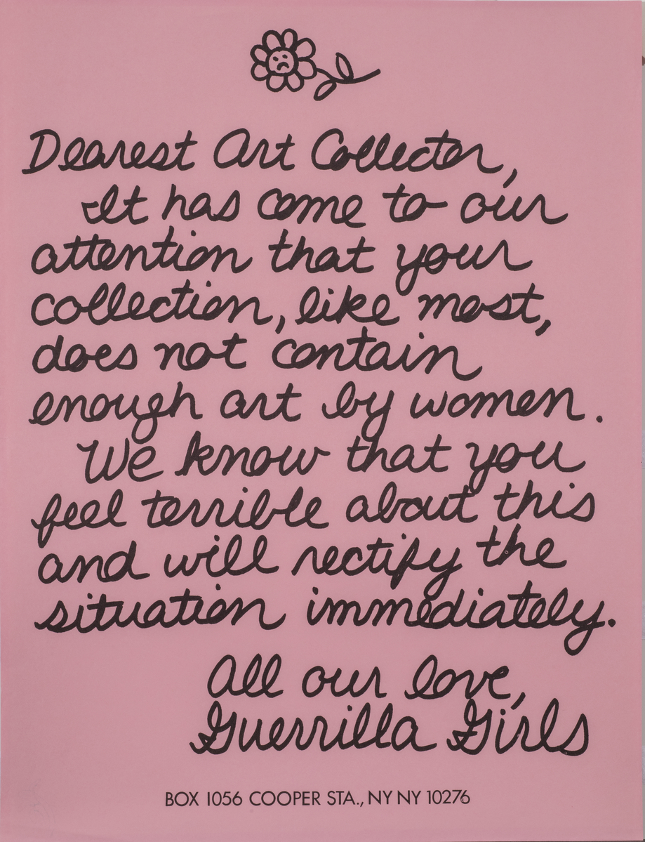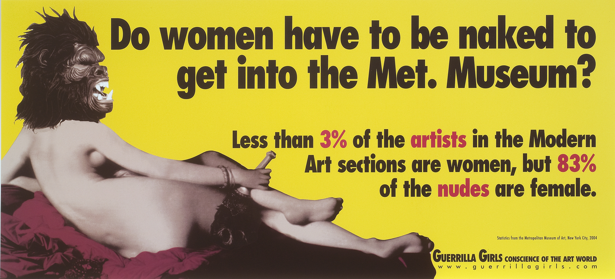 The masterful play between the text’s message, garish pink lettering and yellow backdrop, and the accompanying image intensifies the poster’s punch. A reproduction of the reclining nude from Jean-Auguste-Dominique Ingres’s 1814 “Grande Odalisque” anchors the lower left corner. It is the quintessential pose from the Western fine arts tradition—a naked woman appeasing the male gaze. But in this sly appropriation, the model has been fitted with a gorilla mask, suggesting she has been recruited as a Guerrilla Girl.